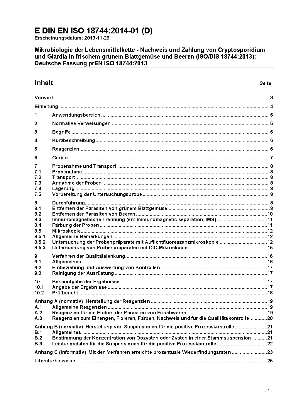 Mikrobiologie der Lebensmittelkette - Nachweis und Zählung von Cryptosporidium und Giardia in frischem grünem Blattgemüse und Beeren (ISO/DIS 18744:2013); Deutsche Fassung prEN ISO 18744:2013