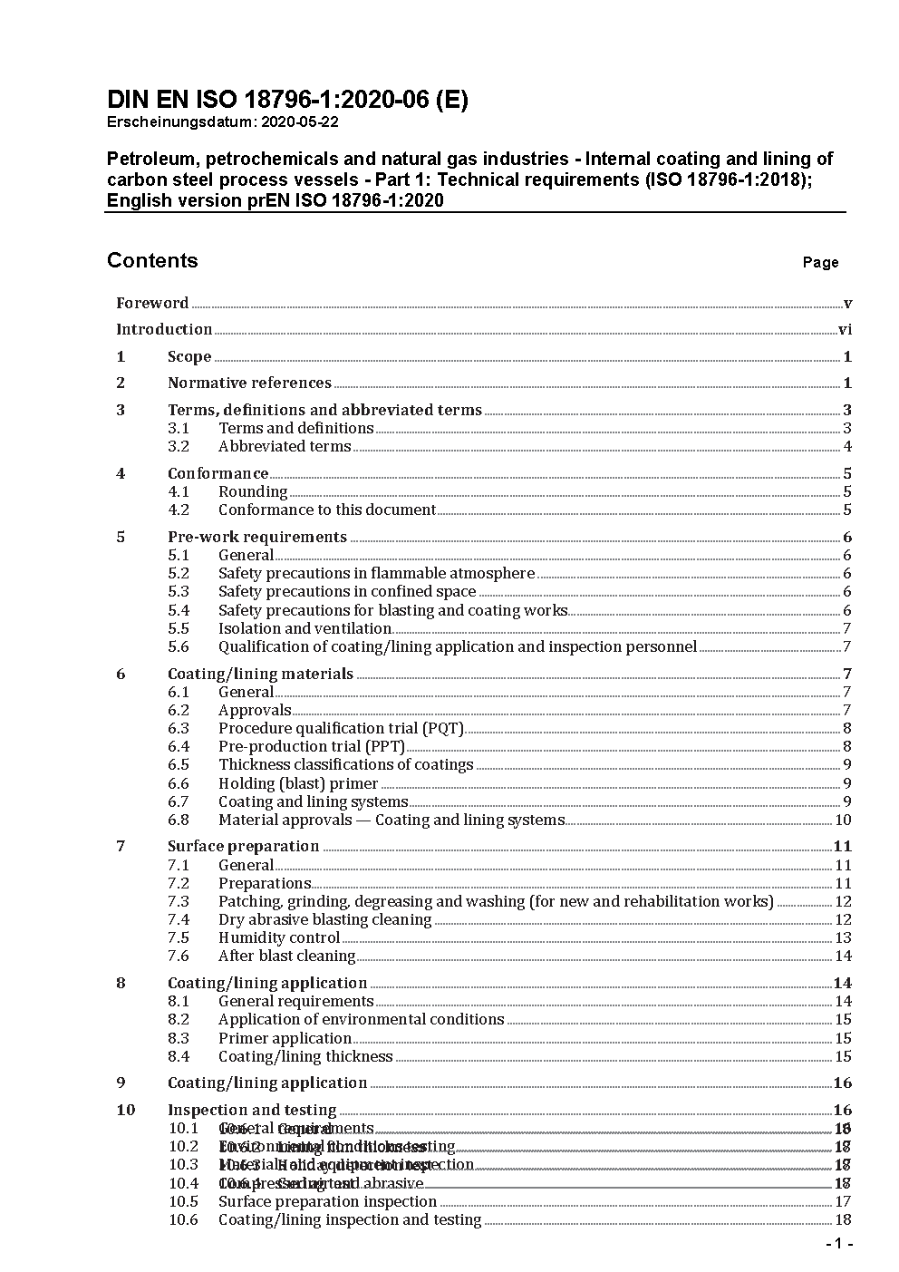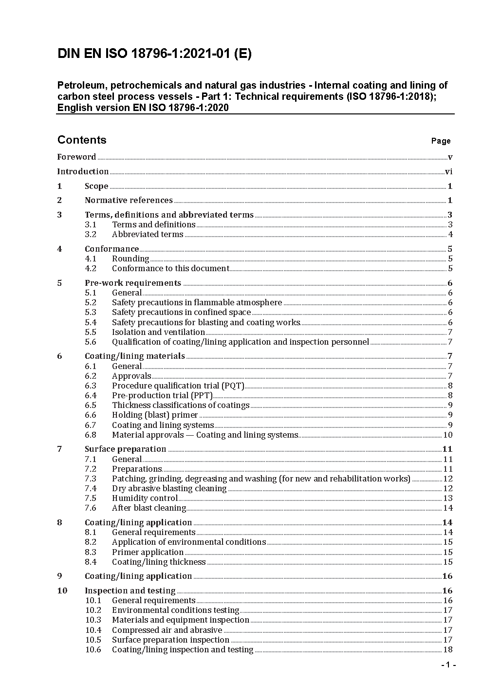 Erdöl-, petrochemische und Erdgasindustrie - Innere Schutzbeschichtungen und Auskleidungen für Prozessbehälter aus unlegiertem Stahl - Teil 1: Allgemeine Anforderungen (ISO 18796-1:2018); Englische Fassung EN ISO 18796-1:2020