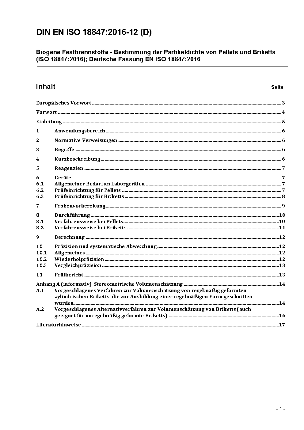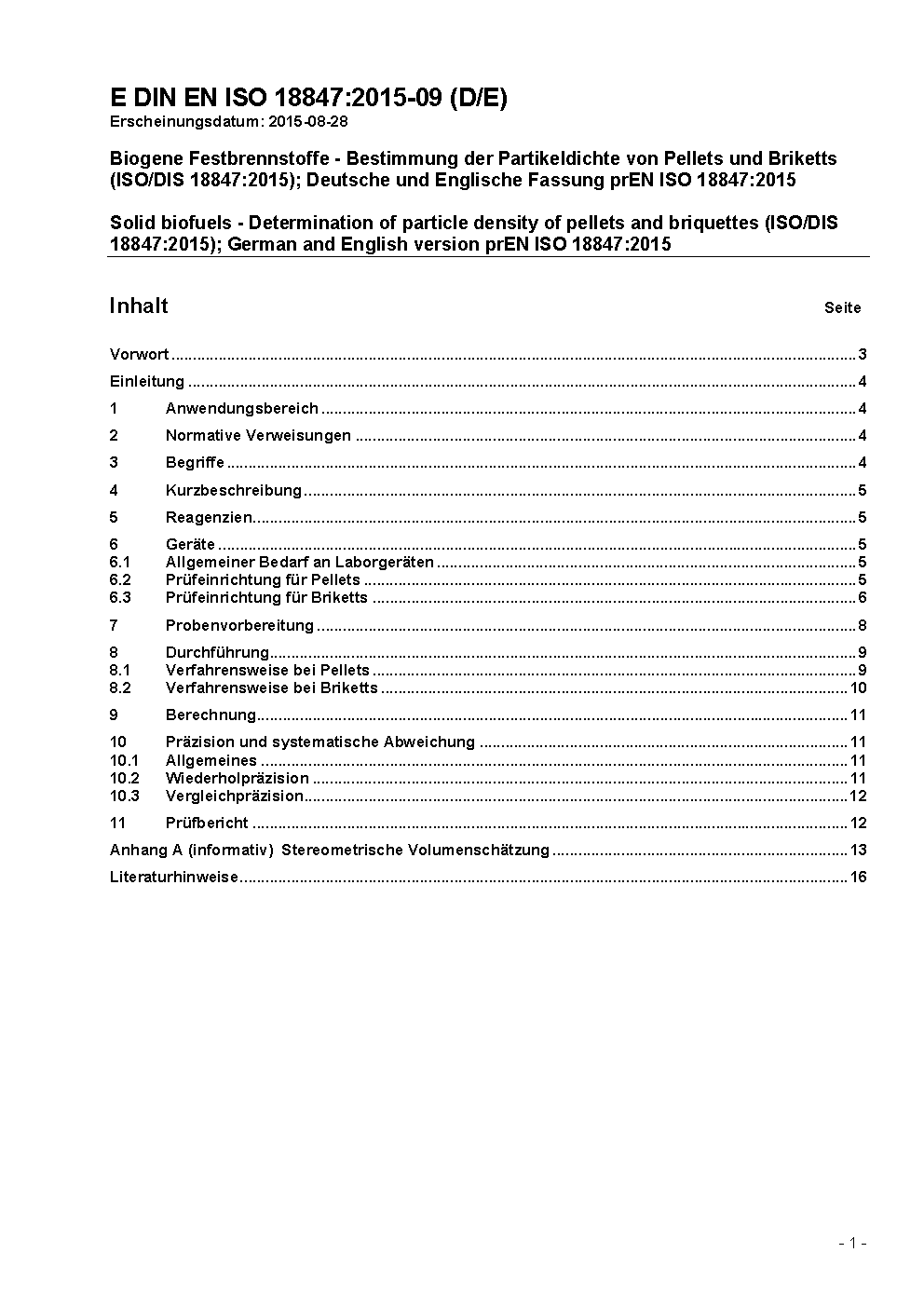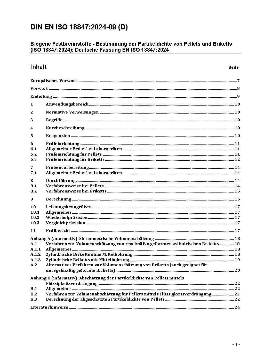 Biogene Festbrennstoffe - Bestimmung der Partikeldichte von Pellets und Briketts (ISO/DIS 18847:2023); Deutsche und Englische Fassung prEN ISO 18847:2023