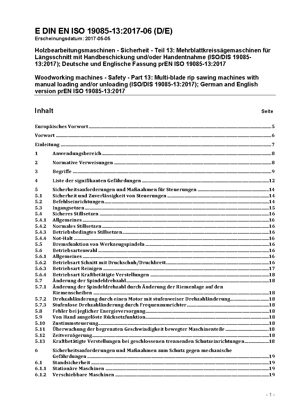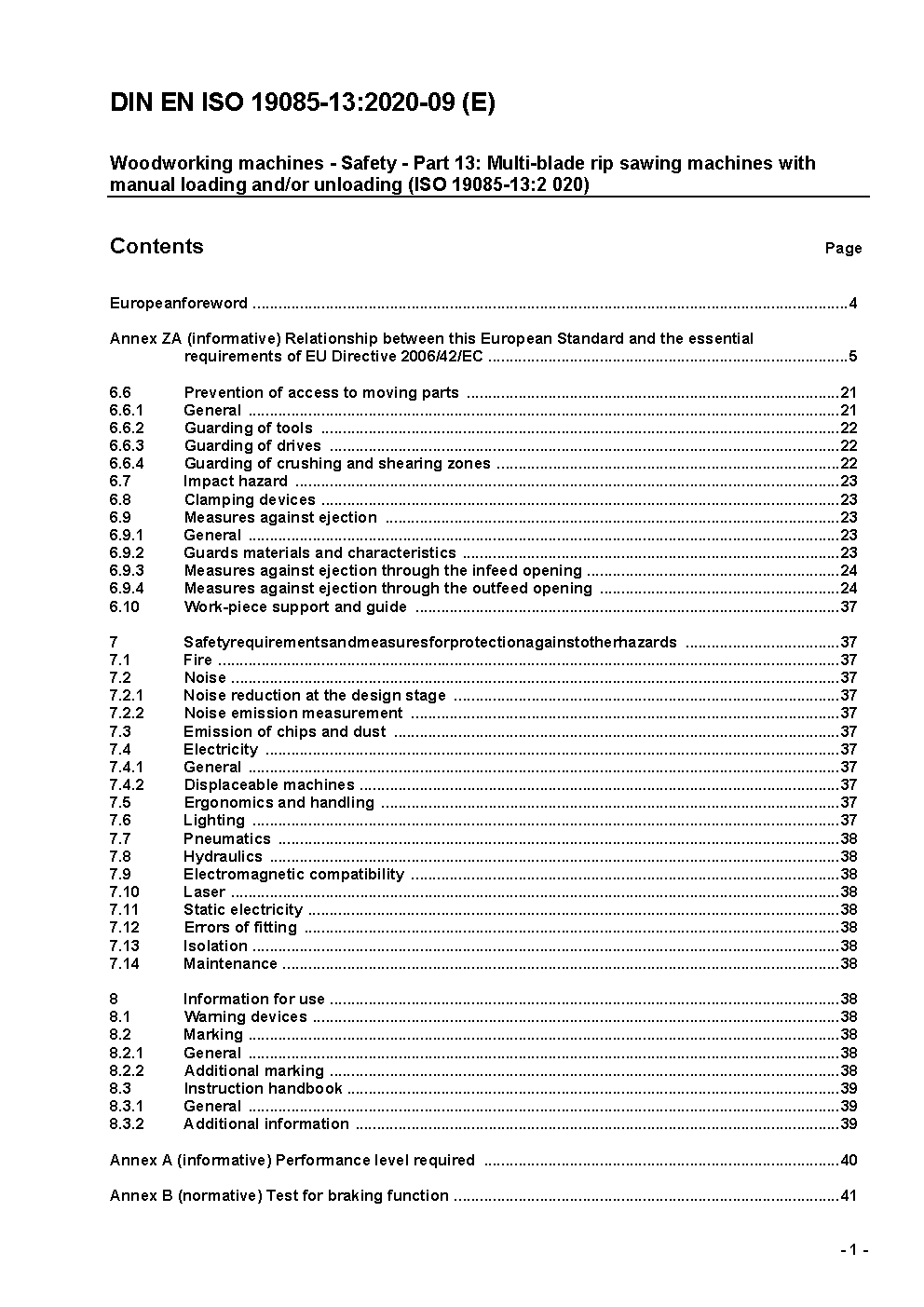 Woodworking machines - Safety - Part 13: Multi-blade rip sawing machines with manual loading and/or unloading (ISO 19085-13:2020); German version EN ISO 19085-13:2020