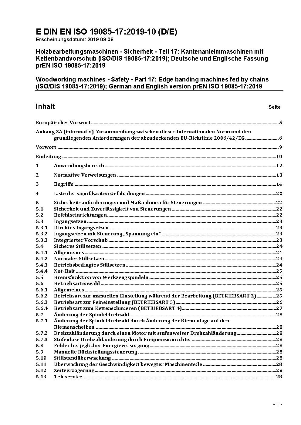 Holzbearbeitungsmaschinen - Sicherheit - Teil 17: Kantenanleimmaschinen mit Kettenbandvorschub (ISO/DIS 19085-17:2019); Deutsche und Englische Fassung prEN ISO 19085-17:2019
