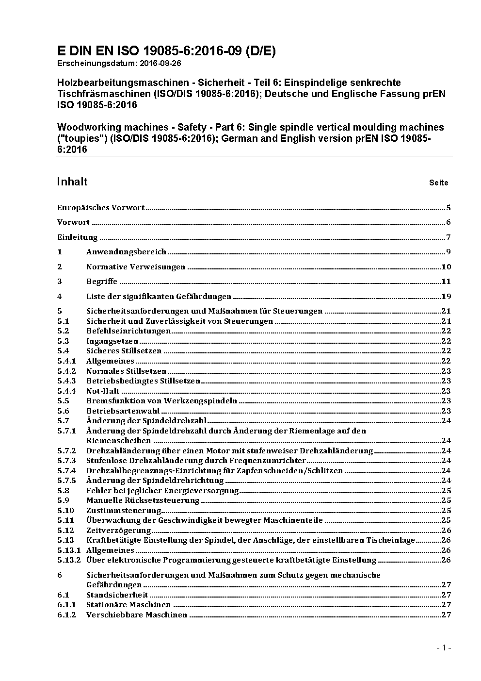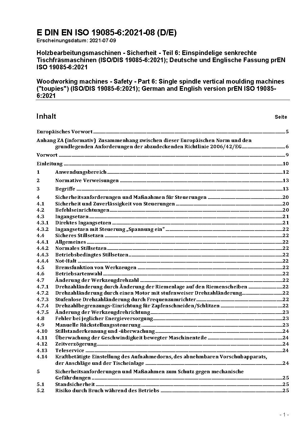 Woodworking machines - Safety - Part 6: Single spindle vertical moulding machines ("toupies") (ISO/DIS 19085-6:2021); German and English version prEN ISO 19085-6:2021