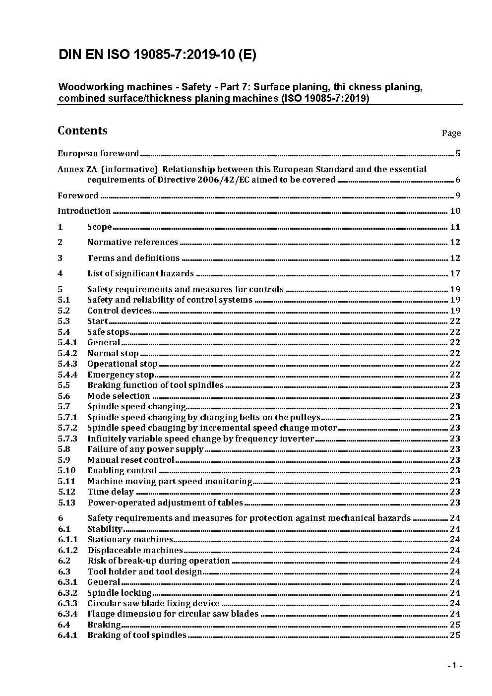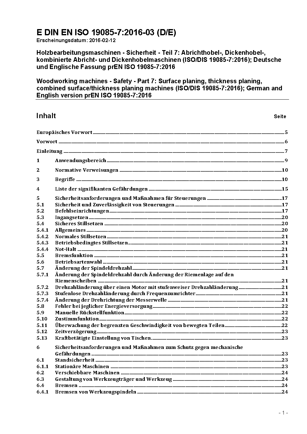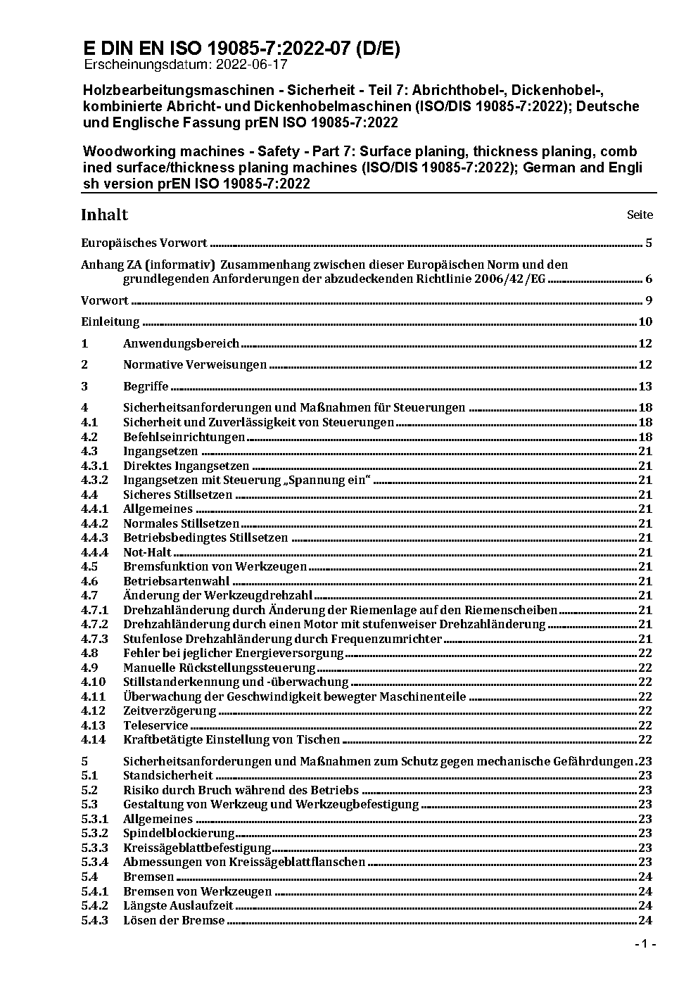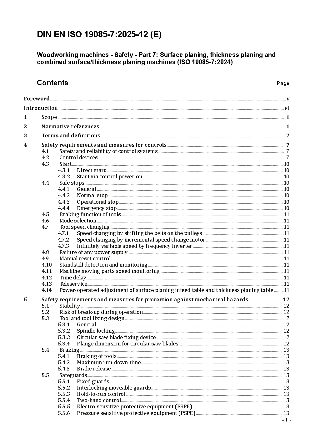 Holzbearbeitungsmaschinen - Sicherheit - Teil 7: Abrichthobel-, Dickenhobel-, kombinierte Abricht- und Dickenhobelmaschinen (ISO 19085-7:2019); Deutsche Fassung EN ISO 19085-7:2019 / Achtung: Gilt in Verbindung mit DIN EN ISO 19085-1 (2018-02)