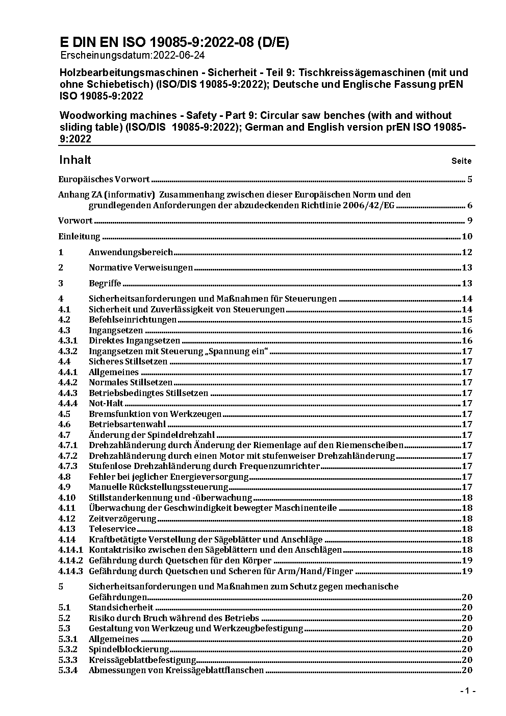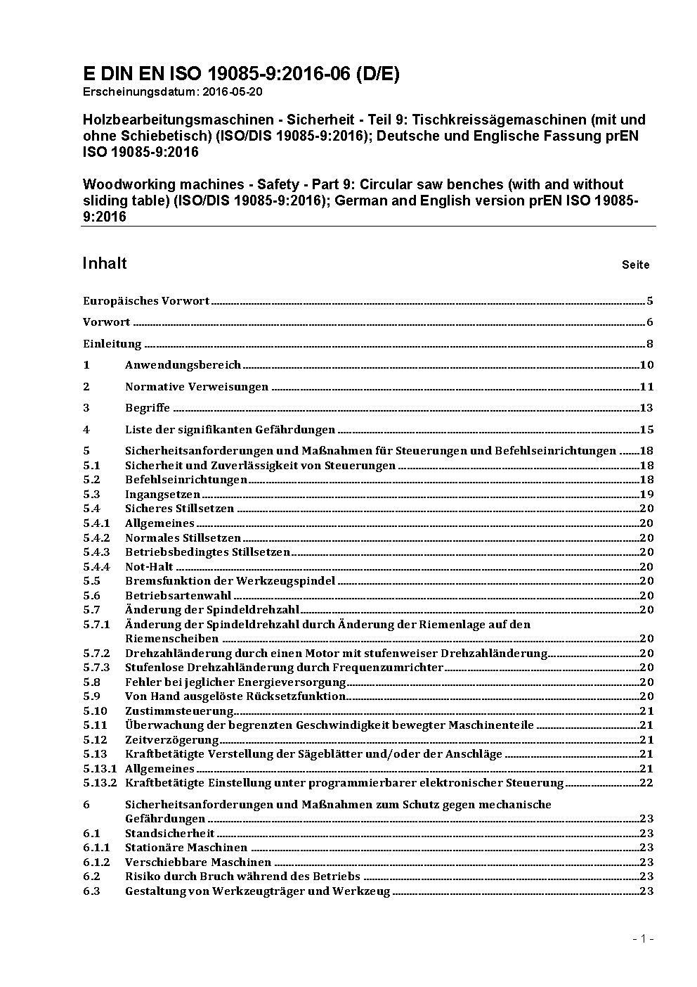 Woodworking machines - Safety - Part 9: Circular saw benches (with and without sliding table) (ISO/DIS 19085-9:2016); German and English version prEN ISO 19085-9:2016