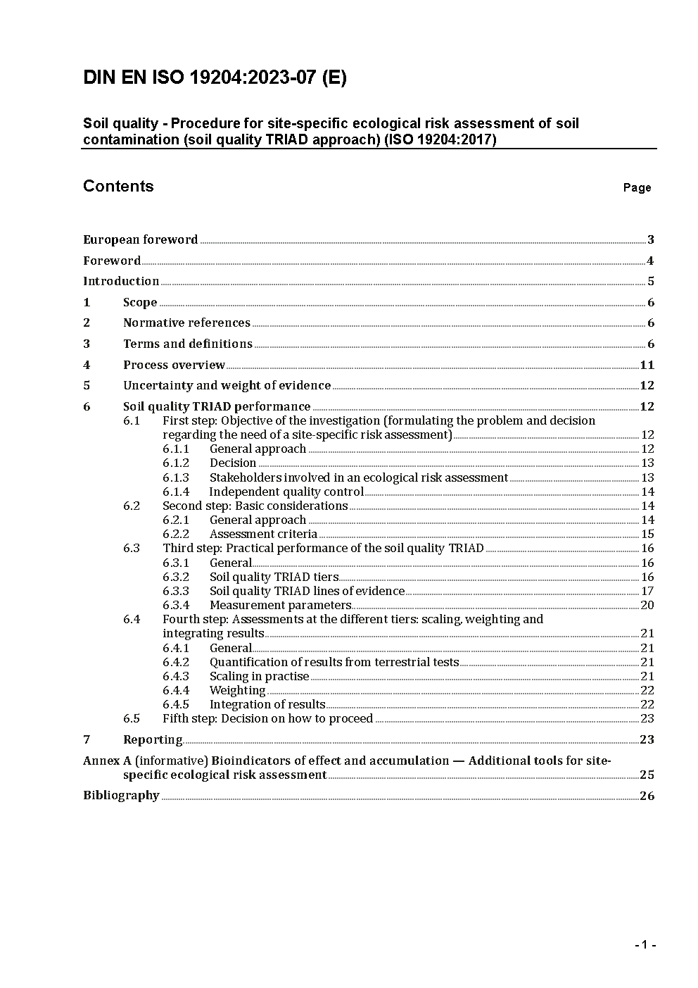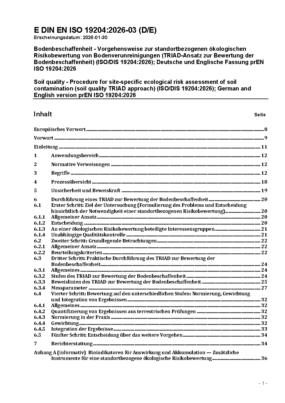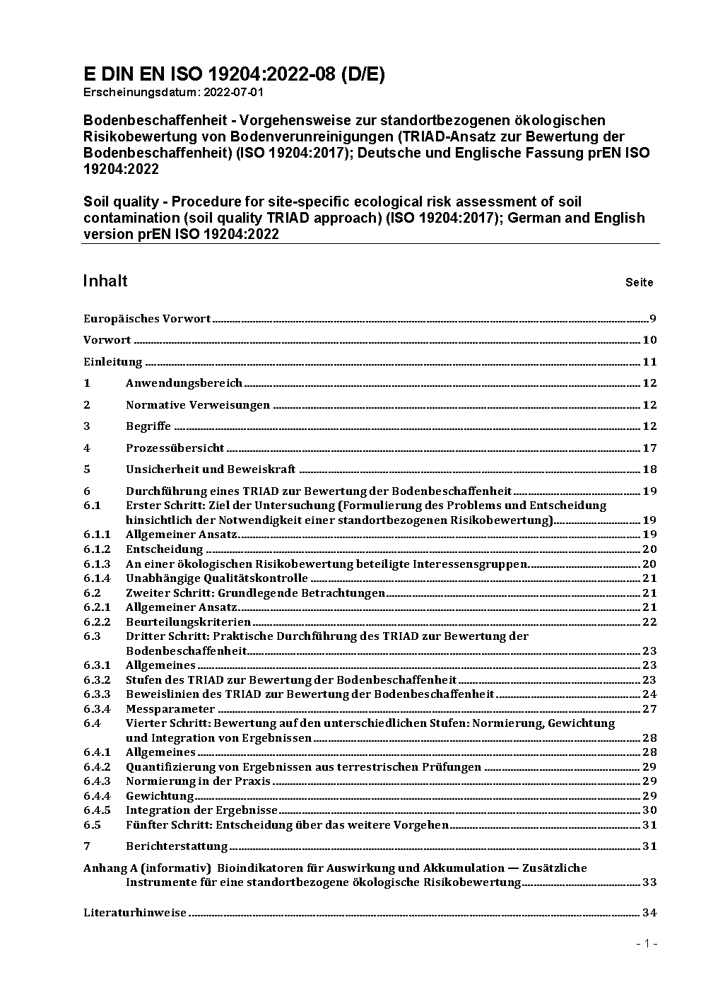 Bodenbeschaffenheit - Vorgehensweise zur standortbezogenen ökologischen Risikobewertung von Bodenverunreinigungen (TRIAD-Ansatz zur Bewertung der Bodenbeschaffenheit) (ISO 19204:2017); Deutsche und Englische Fassung prEN ISO 19204:2022