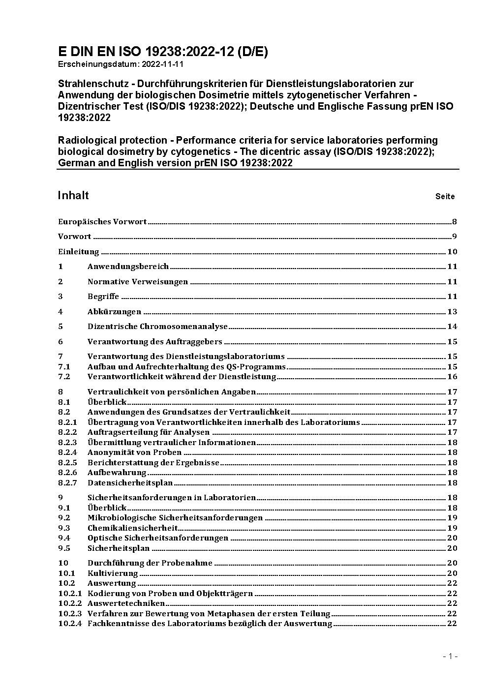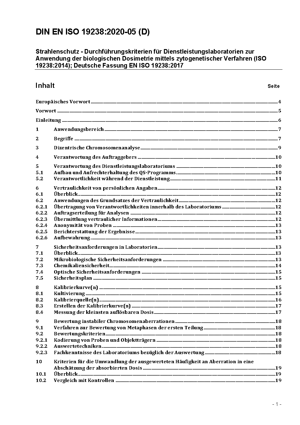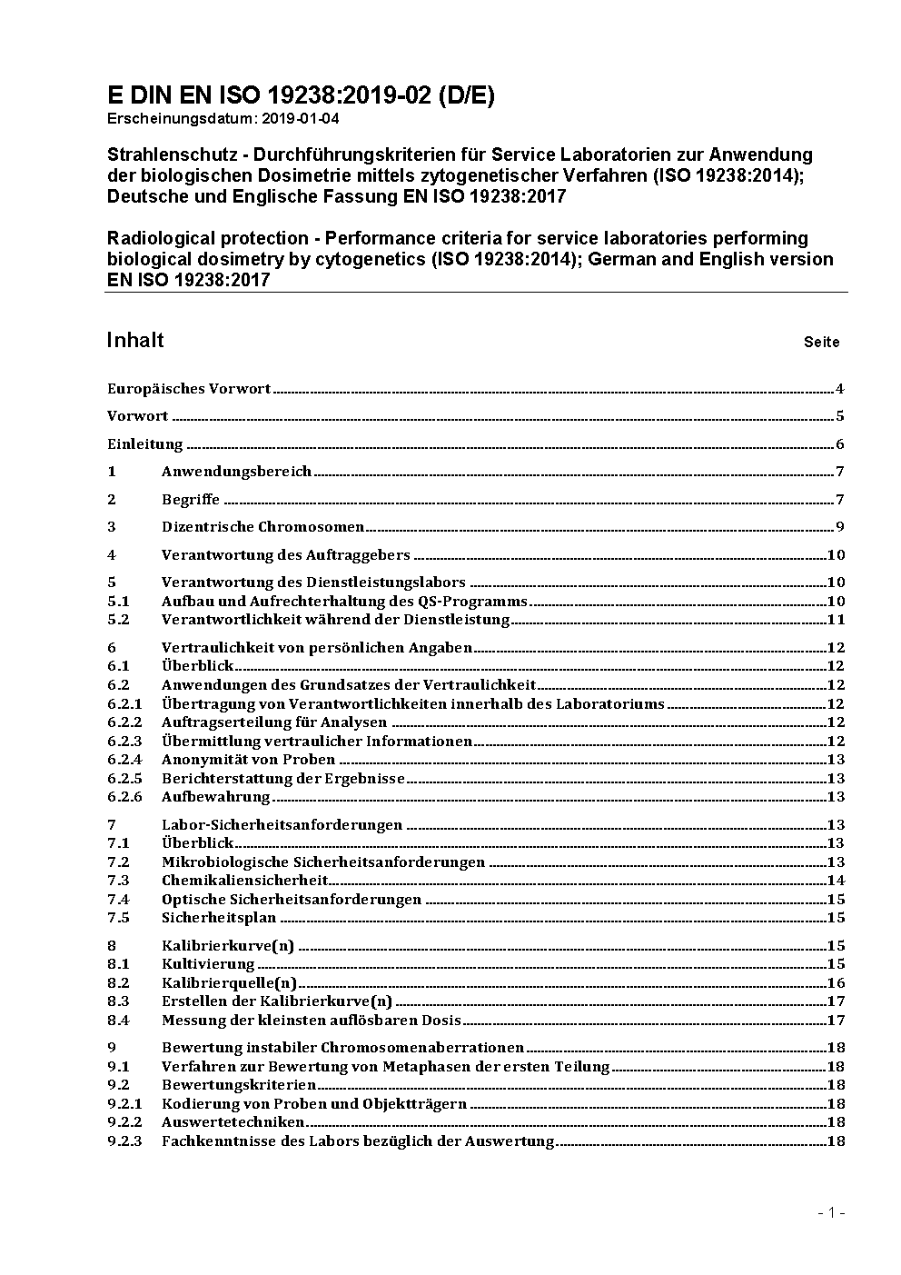 Strahlenschutz - Durchführungskriterien für Service Laboratorien zur Anwendung der biologischen Dosimetrie mittels zytogenetischer Verfahren (ISO 19238:2014); Deutsche und Englische Fassung EN ISO 19238:2017