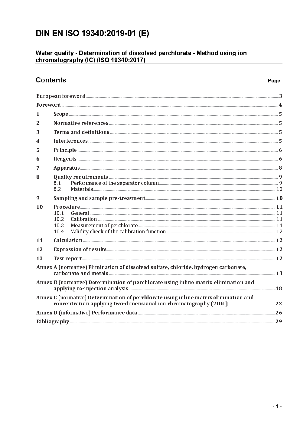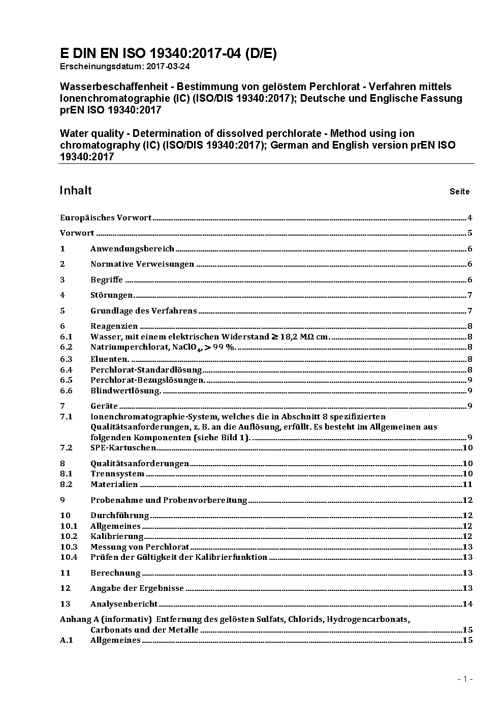 Wasserbeschaffenheit - Bestimmung von gelöstem Perchlorat - Verfahren mittels Ionenchromatographie (IC) (ISO 19340:2017); Deutsche Fassung EN ISO 19340:2017