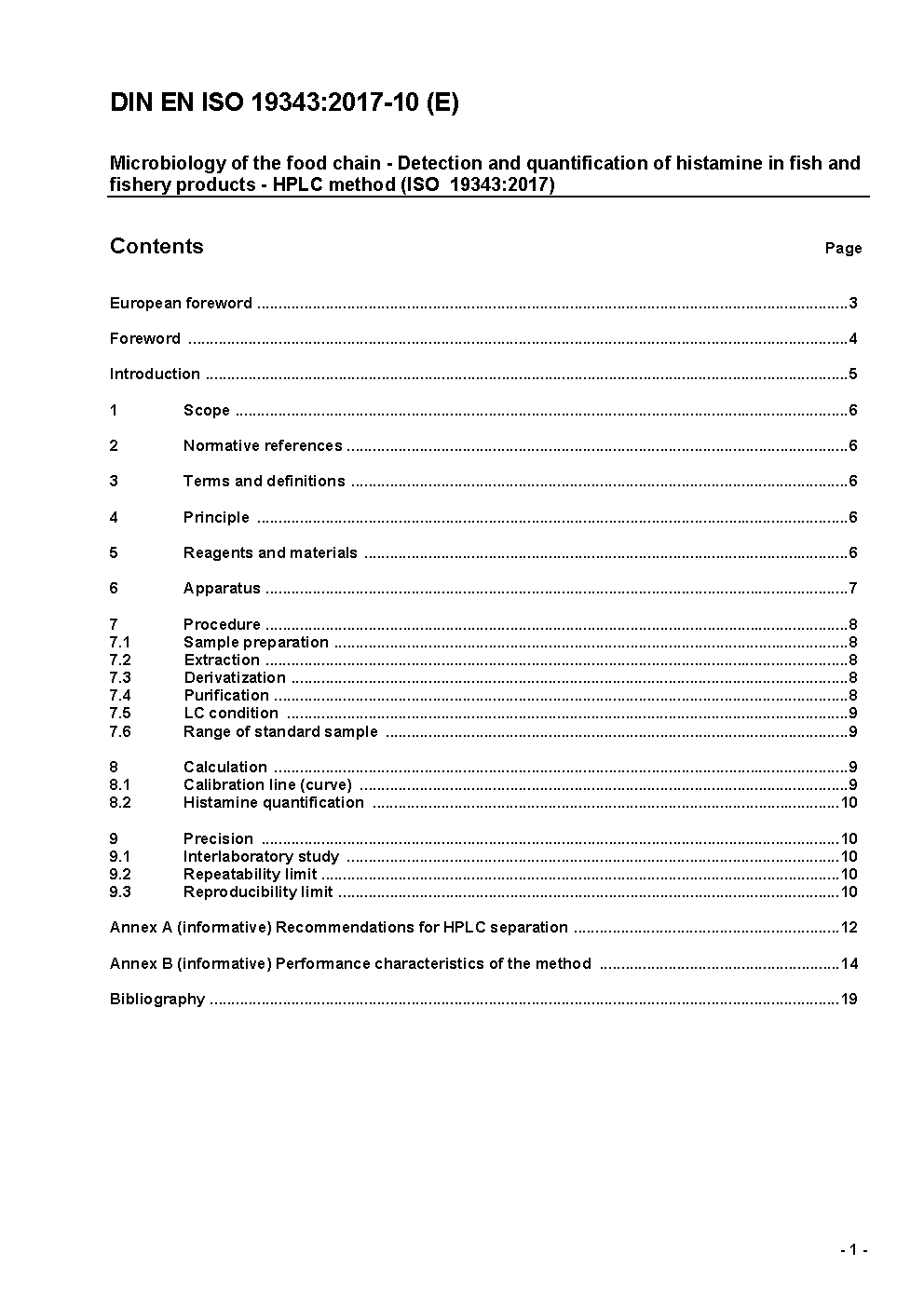 Microbiology of the food chain - Detection and quantification of histamine in fish and fishery products - HPLC method (ISO 19343:2017); German version EN ISO 19343:2017