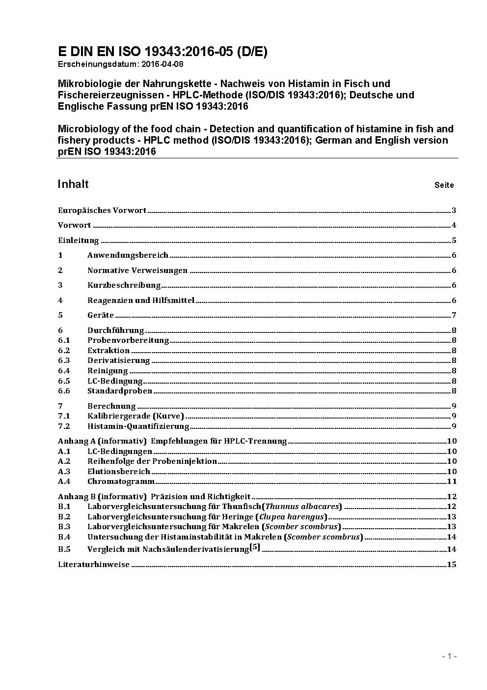 Mikrobiologie der Lebensmittelkette - Nachweis und Bestimmung von Histamin in Fisch und Fischereierzeugnissen - HPLC-Methode (ISO 19343:2017); Deutsche Fassung EN ISO 19343:2017