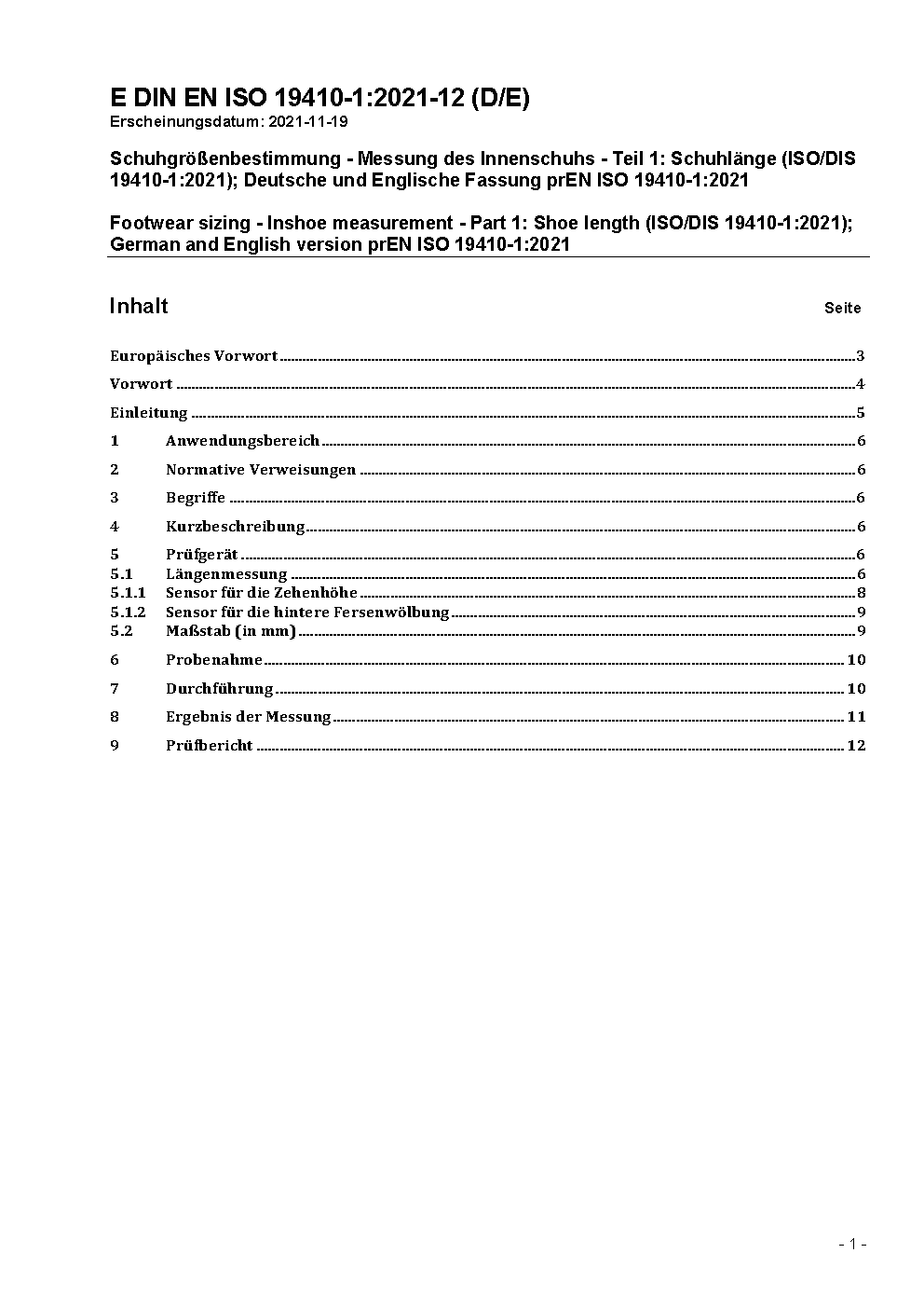 Schuhgrößenbestimmung - Messung des Innenschuhs - Teil 1: Schuhlänge (ISO/DIS 19410-1:2021); Deutsche und Englische Fassung prEN ISO 19410-1:2021