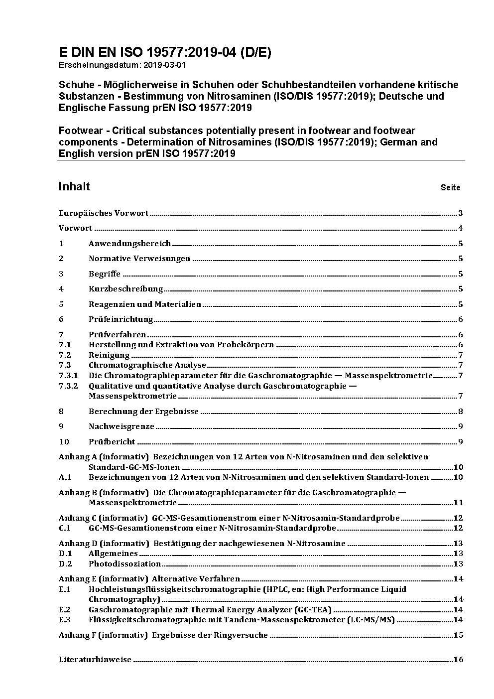 Footwear - Critical substances potentially present in footwear and footwear components - Determination of Nitrosamines (ISO 19577:2019); German version EN ISO 19577:2019