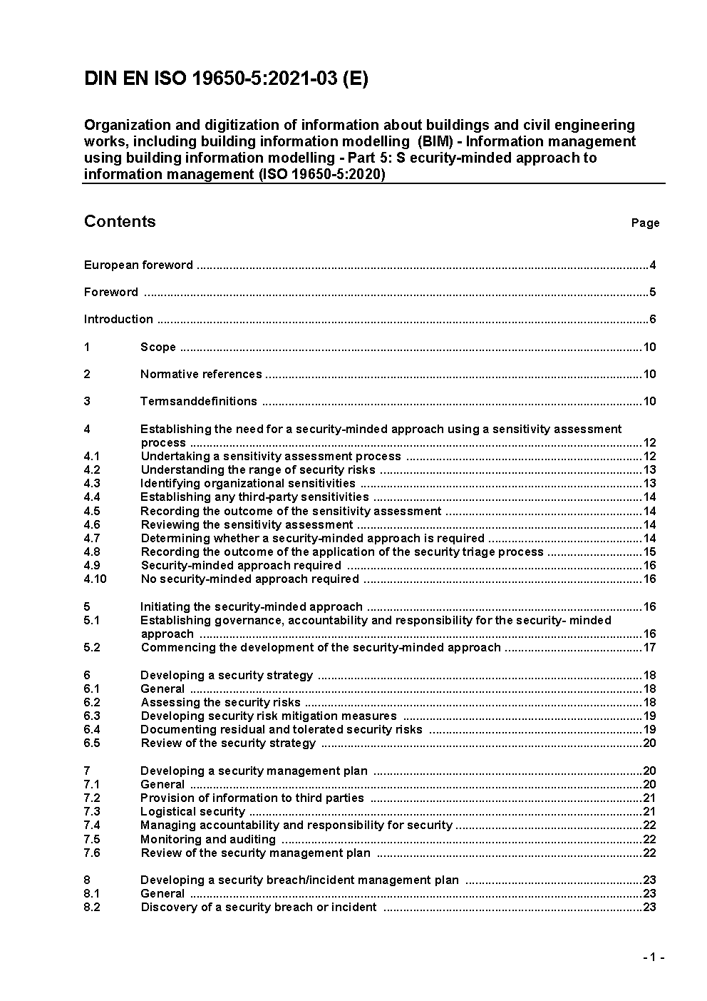 Organisation und Digitalisierung von Informationen zu Bauwerken und Ingenieurleistungen, einschließlich Bauwerksinformationsmodellierung (BIM) - Informationsmanagement mit BIM - Teil 5: Spezifikation für Sicherheitsbelange von BIM, der digitalisierten Bauwerke und des smarten Assetmanagements (ISO 19650-5:2020); Deutsche Fassung EN ISO 19650-5:2020