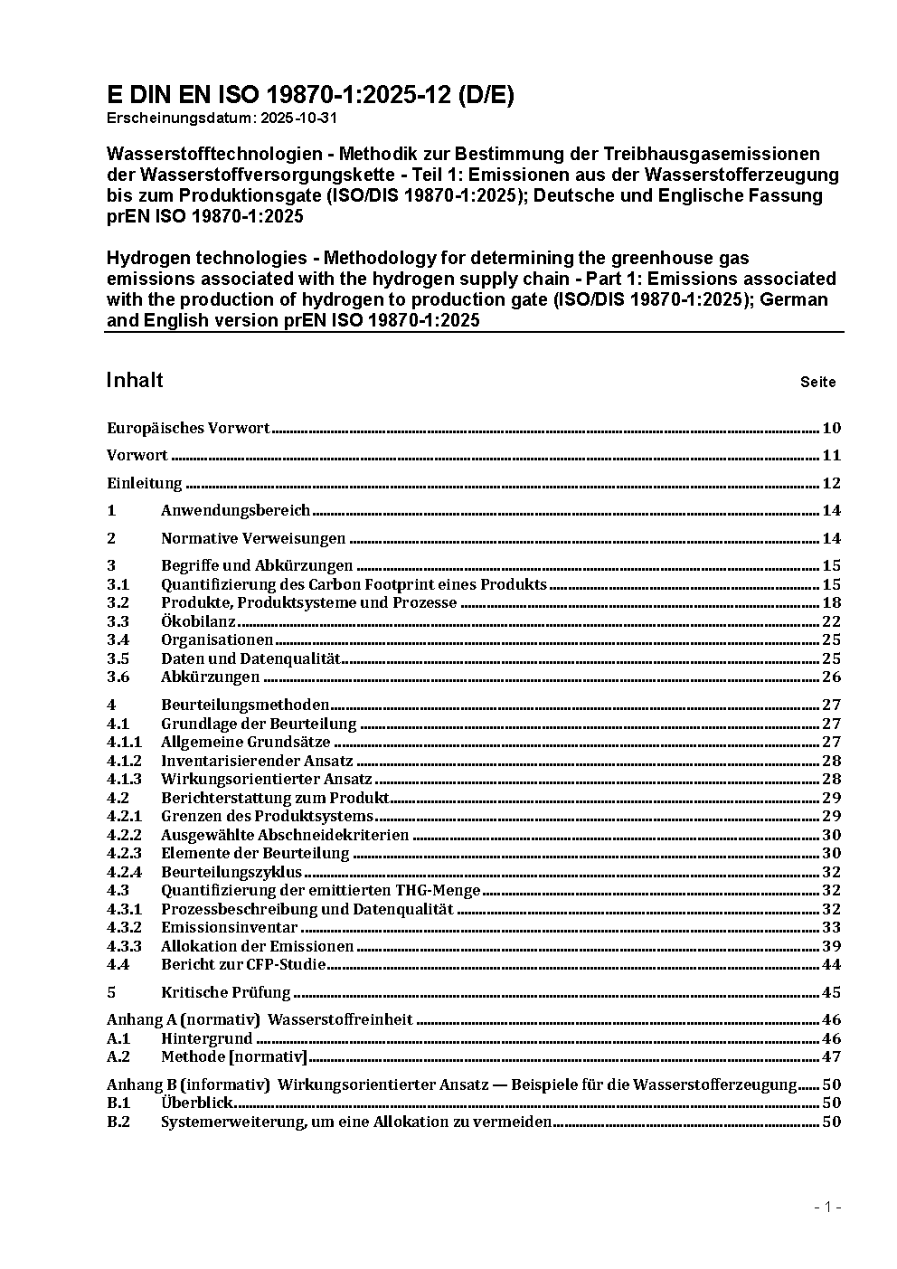 Hydrogen technologies - Methodology for determining the greenhouse gas emissions associated with the hydrogen supply chain - Part 1: Emissions associated with the production of hydrogen to production gate (ISO/DIS 19870-1:2025); German and English version prEN ISO 19870-1:2025