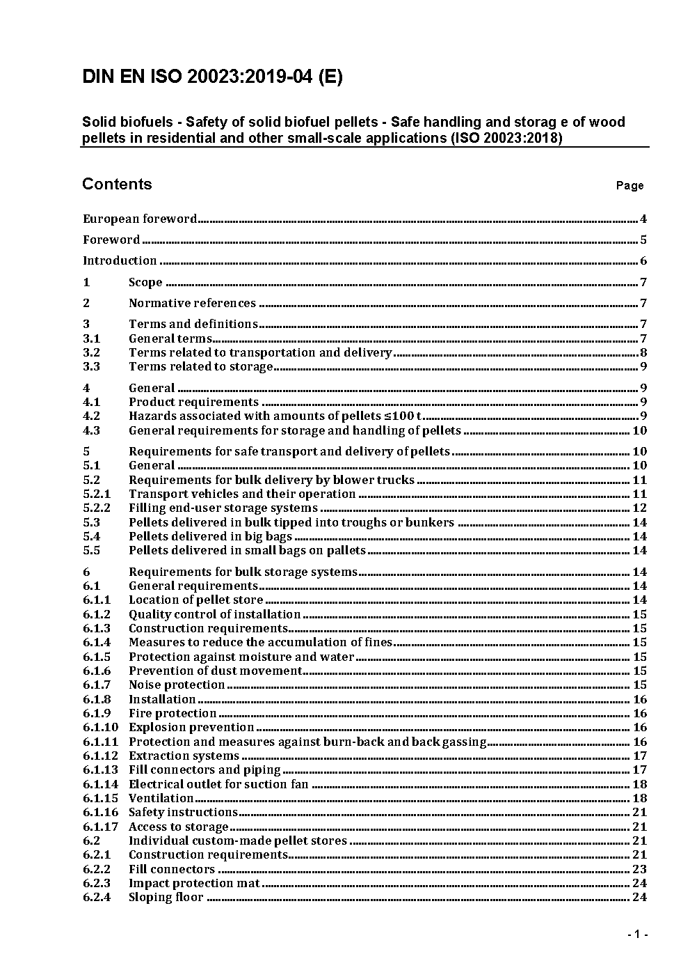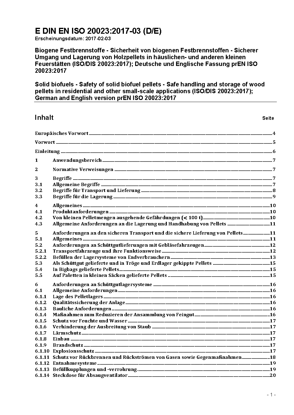 Solid biofuels - Safety of solid biofuel pellets - Safe handling and storage of wood pellets in residential and other small-scale applications (ISO/DIS 20023:2017); German and English version prEN ISO 20023:2017