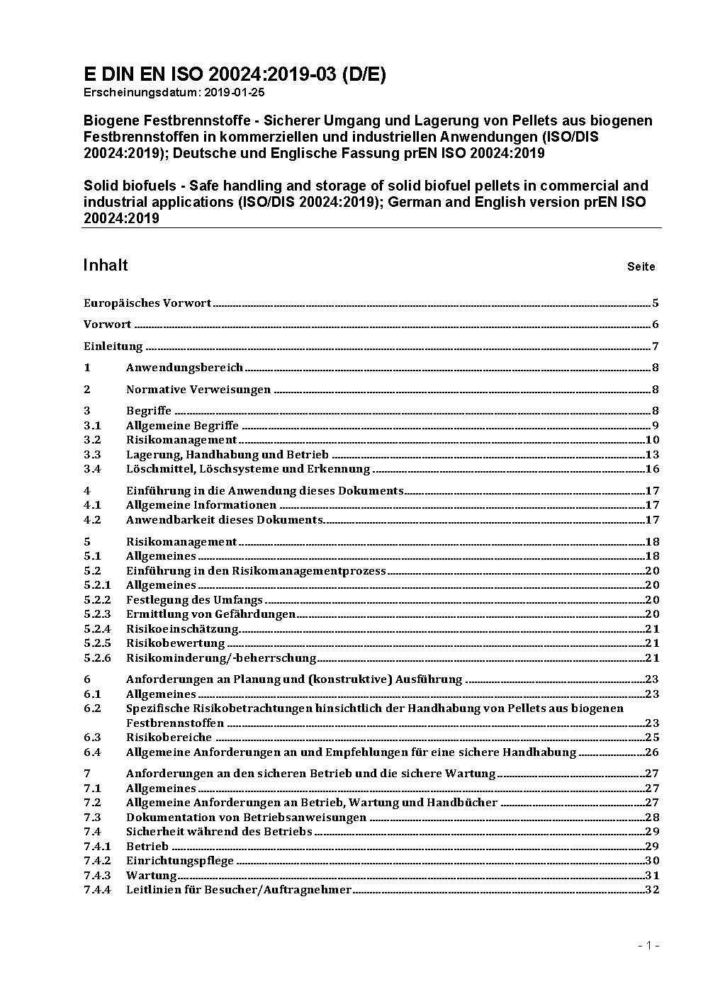 Biogene Festbrennstoffe - Sicherer Umgang und Lagerung von Pellets aus biogenen Festbrennstoffen in kommerziellen und industriellen Anwendungen (ISO/DIS 20024:2019); Deutsche und Englische Fassung prEN ISO 20024:2019