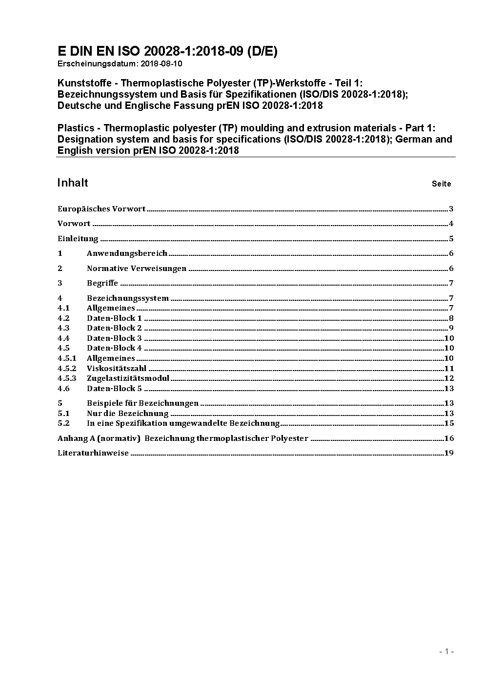 Kunststoffe - Thermoplastische Polyester (TP)-Werkstoffe - Teil 1: Bezeichnungssystem und Basis für Spezifikationen (ISO 20028-1:2017); Deutsche Fassung EN ISO 20028-1:2017