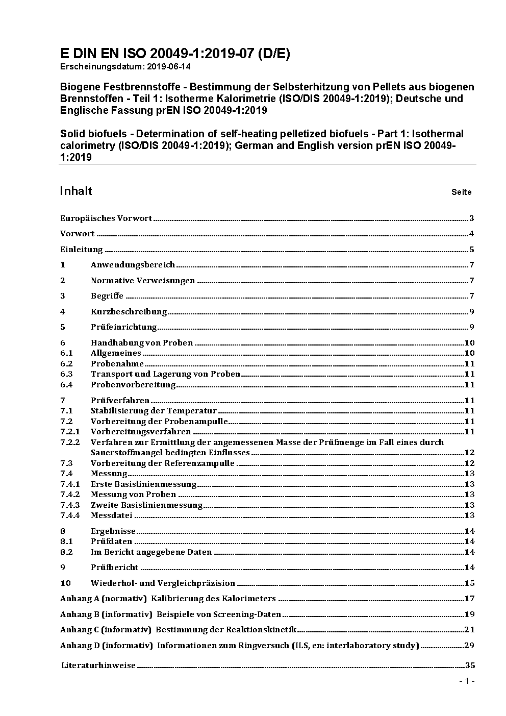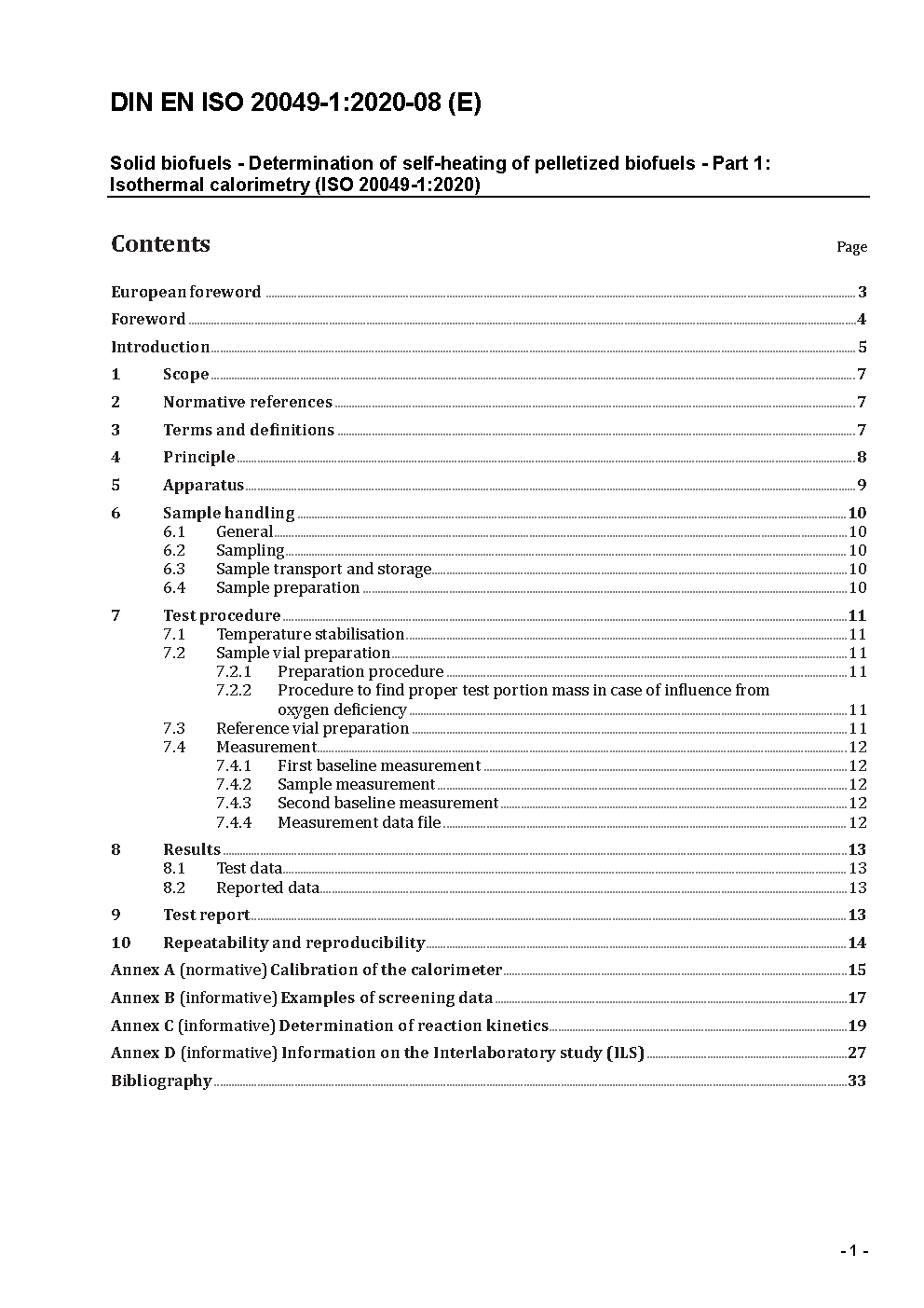 Biogene Festbrennstoffe - Bestimmung der Selbsterhitzung von Pellets aus biogenen Brennstoffen - Teil 1: Isotherme Kalorimetrie (ISO 20049-1:2020); Deutsche Fassung EN ISO 20049-1:2020