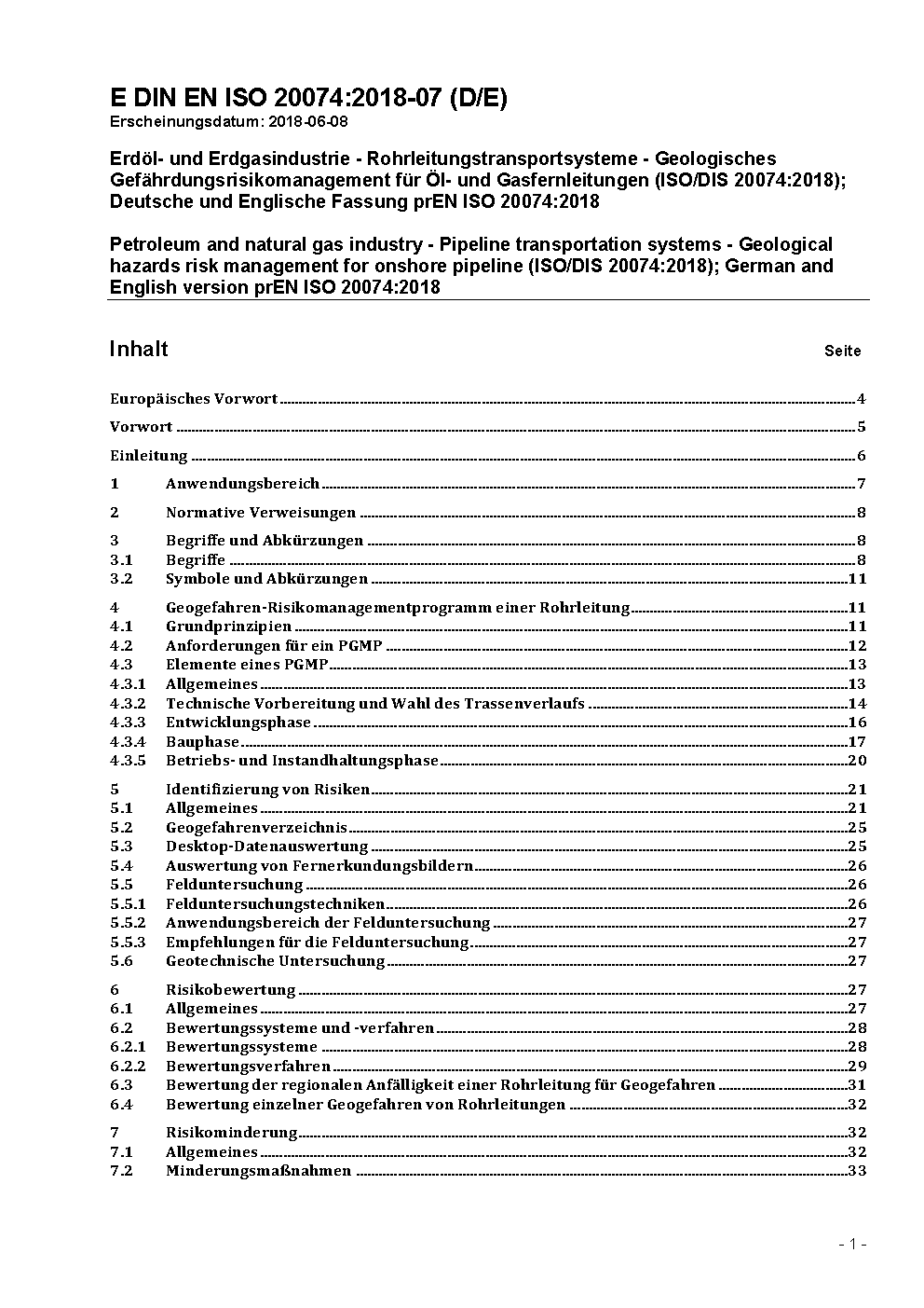 Petroleum and natural gas industry - Pipeline transportation systems - Geological hazards risk management for onshore pipeline (ISO/DIS 20074:2018); German and English version prEN ISO 20074:2018