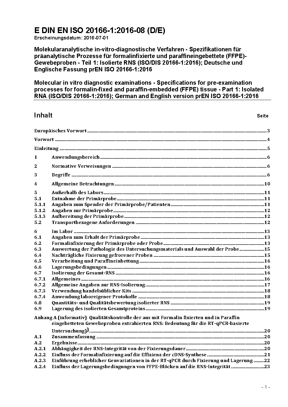 Molecular in vitro diagnostic examinations - Specifications for pre-examination processes for formalin-fixed and paraffin-embedded (FFPE) tissue - Part 1: Isolated RNA (ISO/DIS 20166-1:2016); German and English version prEN ISO 20166-1:2016