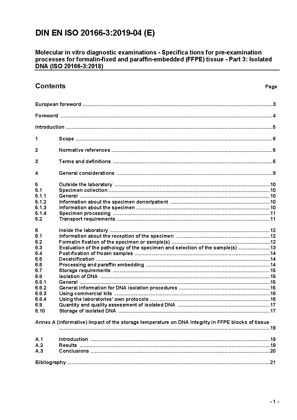 Molecular in vitro diagnostic examinations - Specifications for pre-examination processes for formalin-fixed and paraffin-embedded (FFPE) tissue - Part 3: Isolated DNA (ISO/DIS 20166-3:2016); German and English version prEN ISO 20166-3:2016
