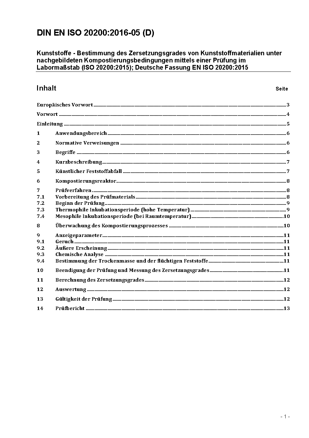 Kunststoffe - Bestimmung des Zersetzungsgrades von Kunststoffmaterialien unter nachgebildeten Kompostierungsbedingungen mittels einer Prüfung im Labormaßstab (ISO/DIS 20200:2013); Deutsche Fassung (prEN ISO 20200:2013)