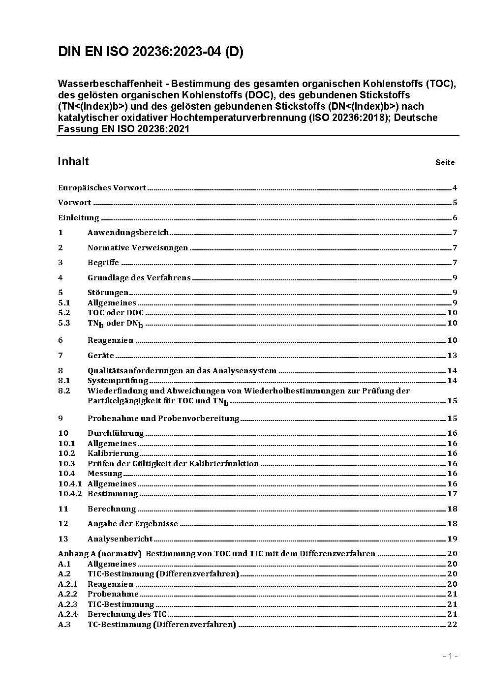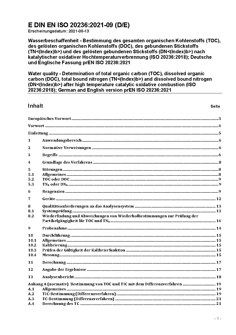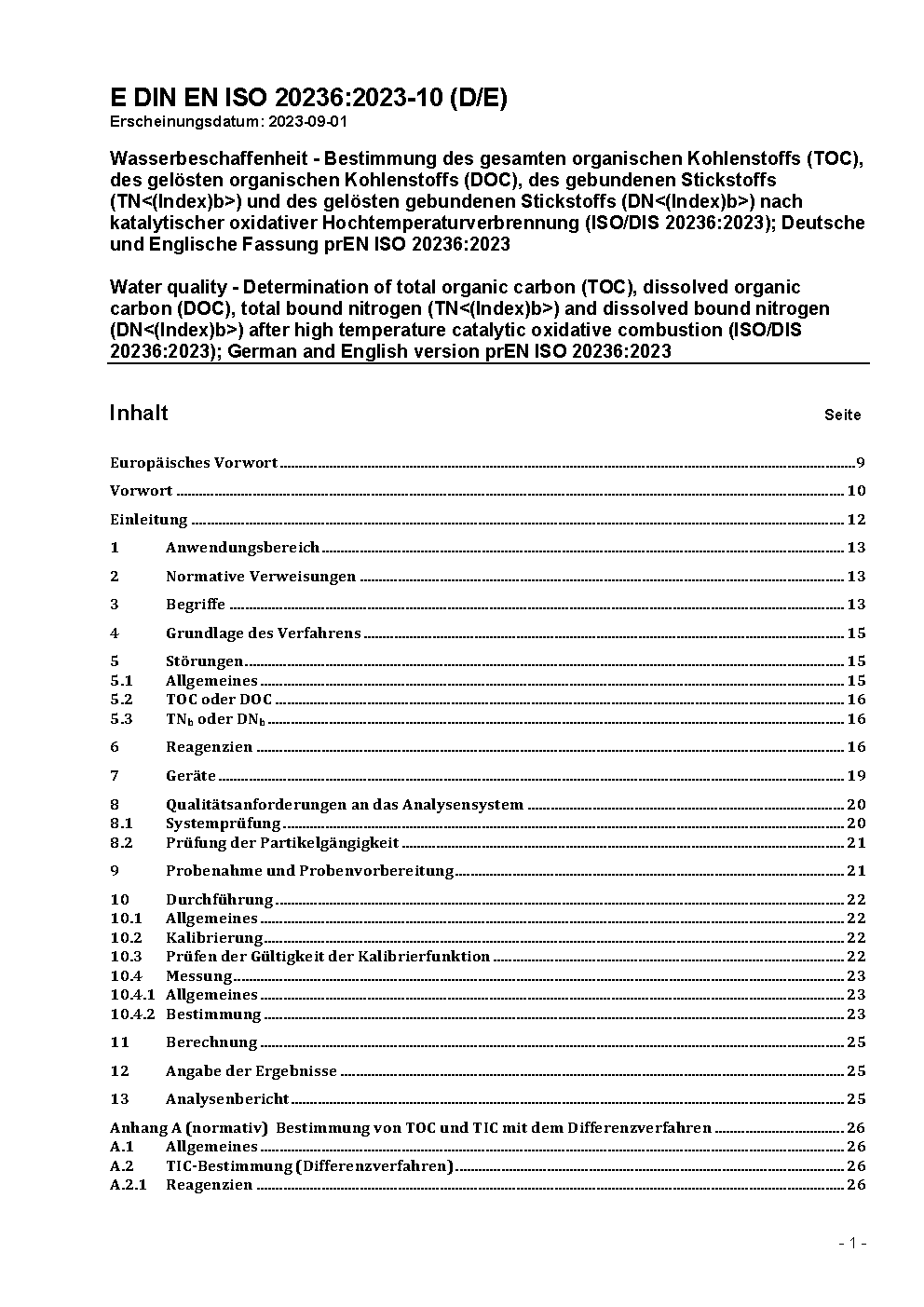 Wasserbeschaffenheit - Bestimmung des gesamten organischen Kohlenstoffs (TOC), des gelösten organischen Kohlenstoffs (DOC), des gebundenen Stickstoffs (TN<(Index)b>) und des gelösten gebundenen Stickstoffs (DN<(Index)b>) nach katalytischer oxidativer Hochtemperaturverbrennung (ISO/DIS 20236:2023); Deutsche und Englische Fassung prEN ISO 20236:2023
