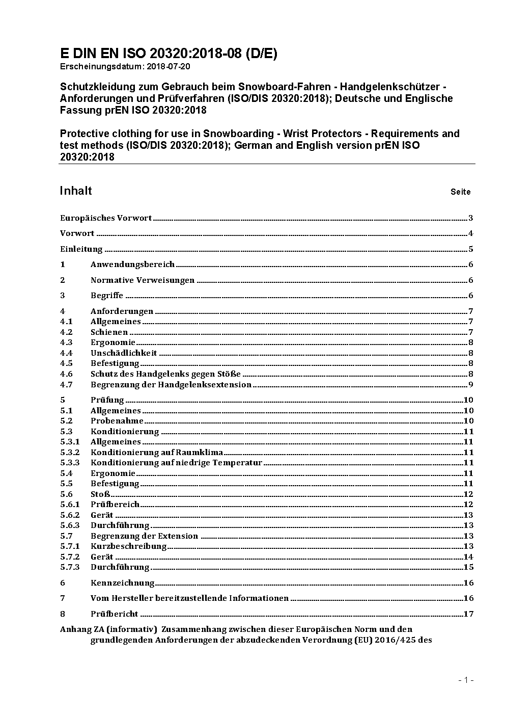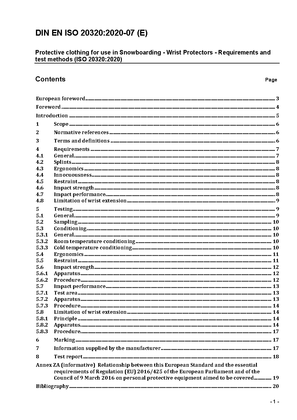 Protective clothing for use in Snowboarding - Wrist Protectors - Requirements and test methods (ISO 20320:2020); German version EN ISO 20320:2020