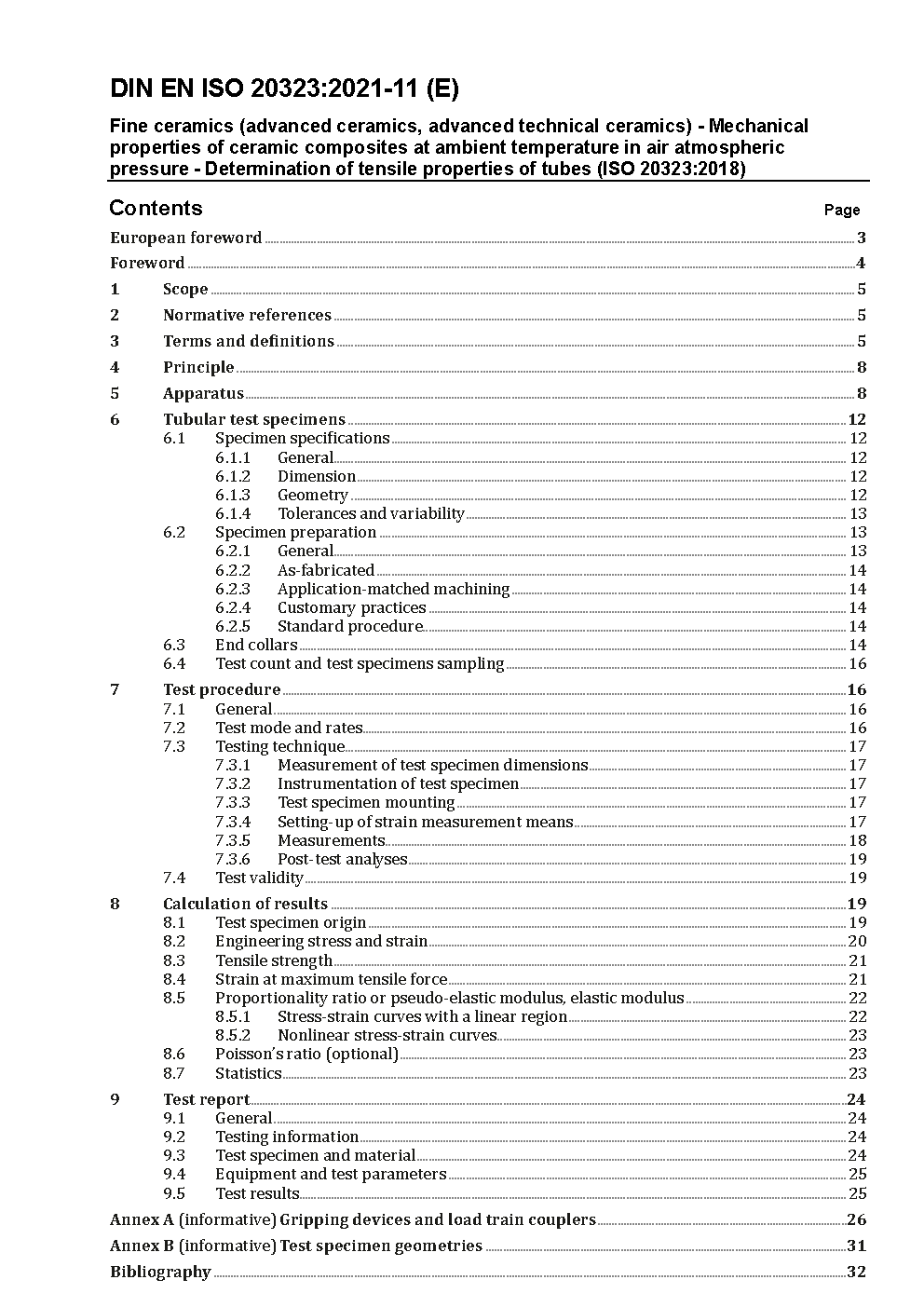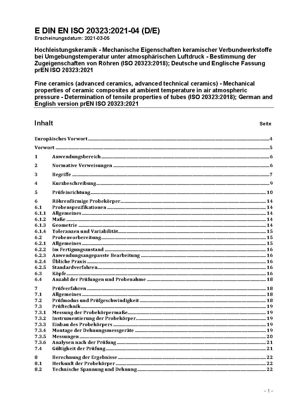 Hochleistungskeramik - Mechanische Eigenschaften keramischer Verbundwerkstoffe bei Umgebungstemperatur unter atmosphärischem Luftdruck - Bestimmung der Zugeigenschaften von Röhren (ISO 20323:2018); Deutsche Fassung EN ISO 20323:2021