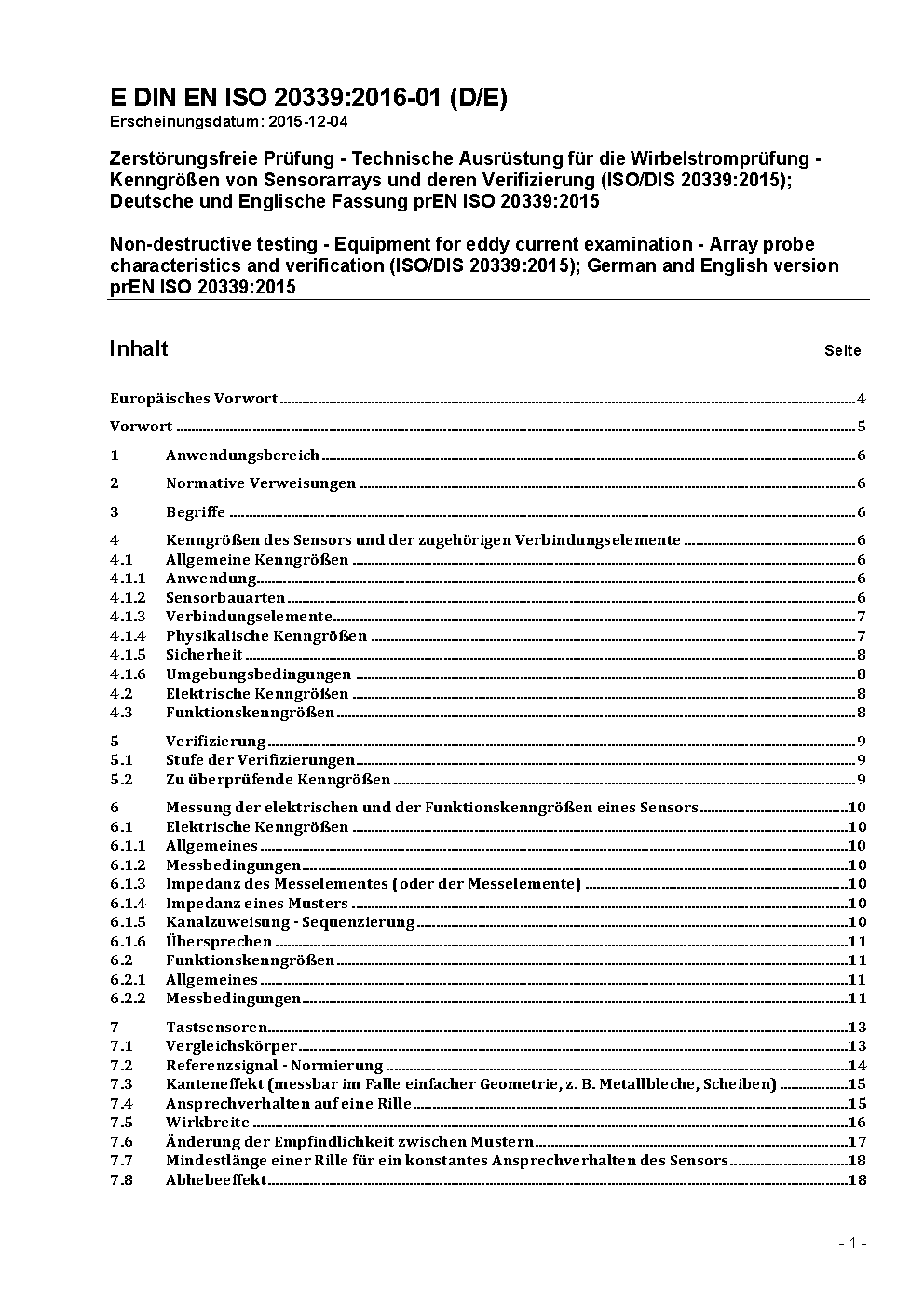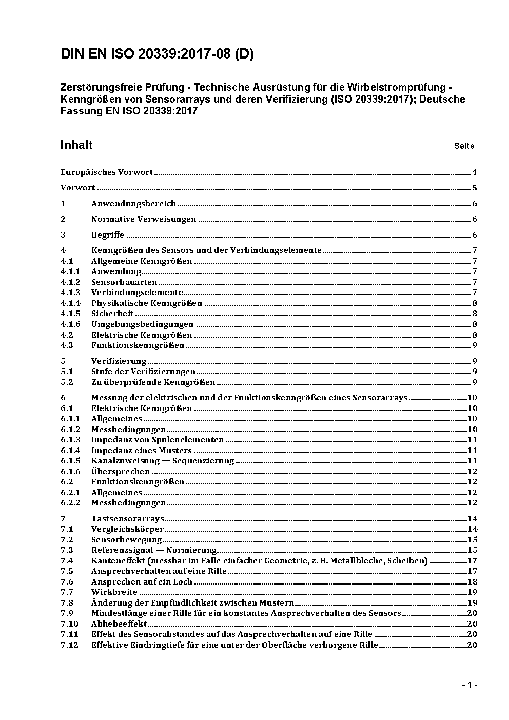 Zerstörungsfreie Prüfung - Technische Ausrüstung für die Wirbelstromprüfung - Kenngrößen von Sensorarrays und deren Verifizierung (ISO 20339:2017); Deutsche Fassung EN ISO 20339:2017