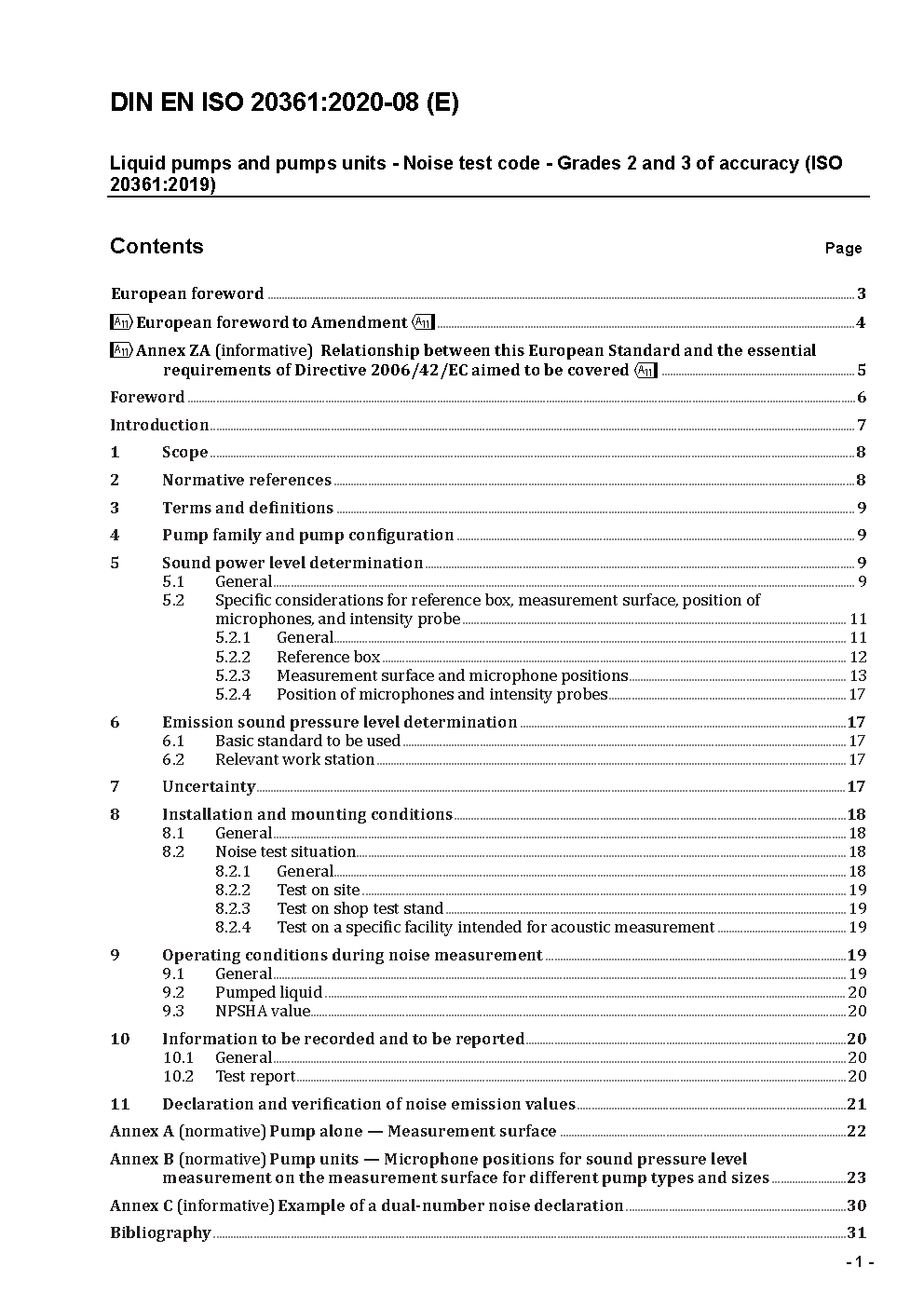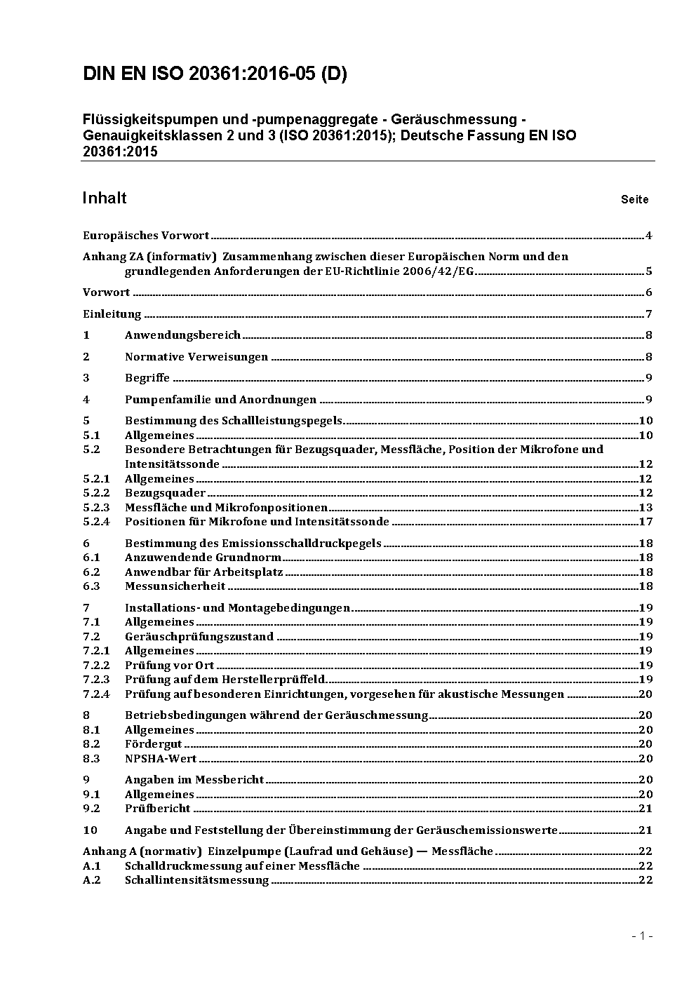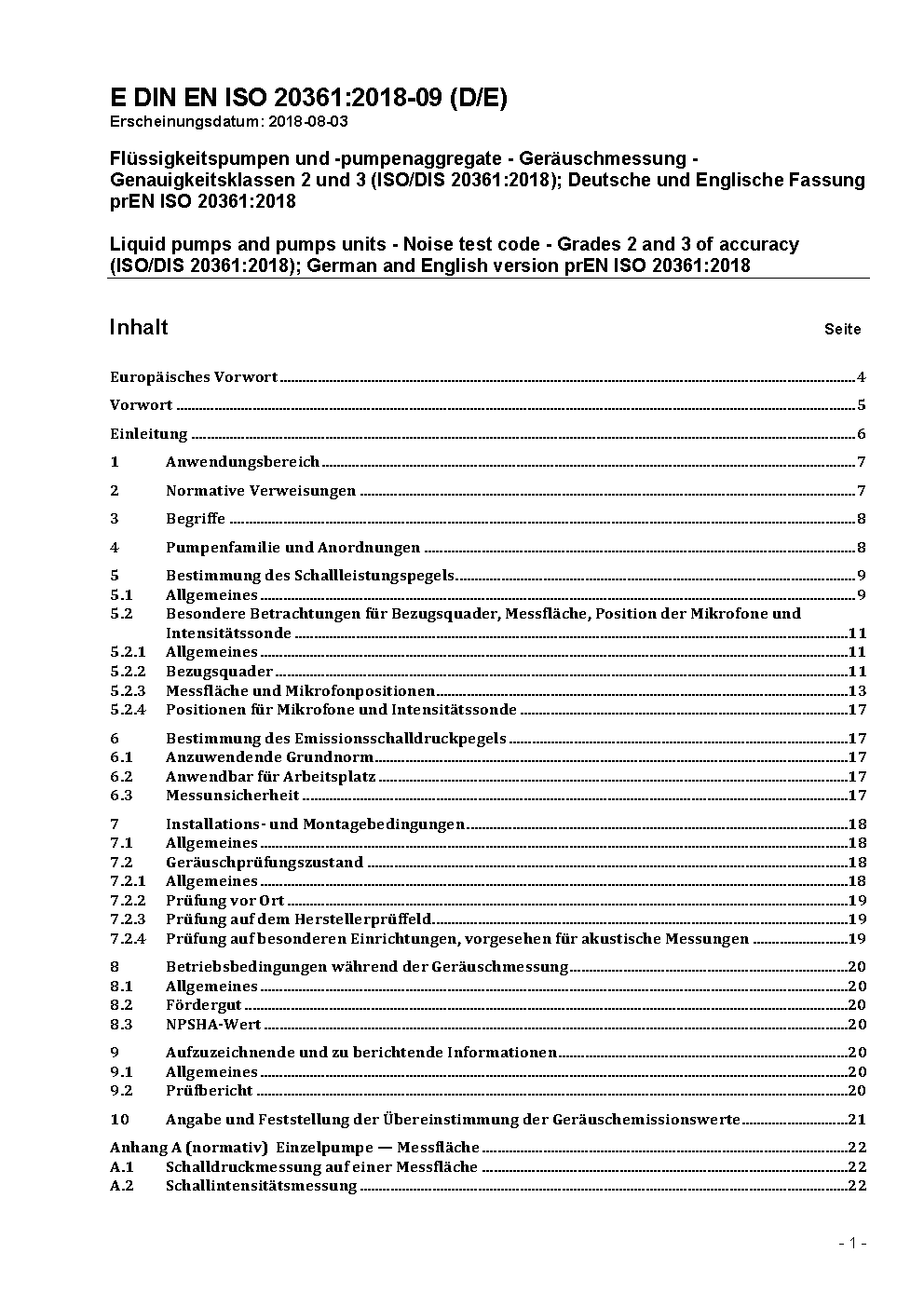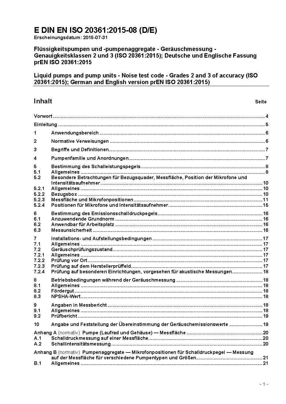 Flüssigkeitspumpen und -pumpenaggregate - Geräuschmessung - Genauigkeitsklassen 2 und 3 (ISO 20361:2007); Deutsche Fassung EN ISO 20361:2009