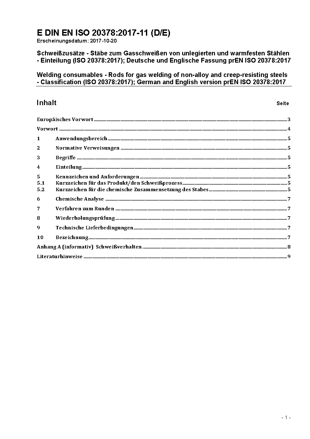 Schweißzusätze - Stäbe zum Gasschweißen von unlegierten und warmfesten Stählen - Einteilung (ISO 20378:2017); Deutsche und Englische Fassung prEN ISO 20378:2017