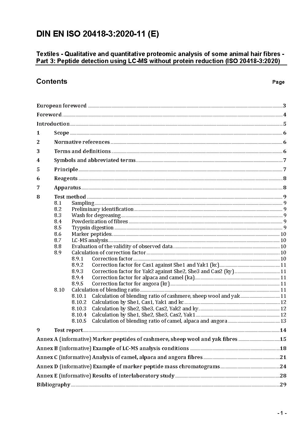 Textiles - Qualitative and quantitative proteomic analysis of some animal hair fibres - Part 3: Peptide detection using LC-MS without protein reduction (ISO 20418-3:2020); German version EN ISO 20418-3:2020