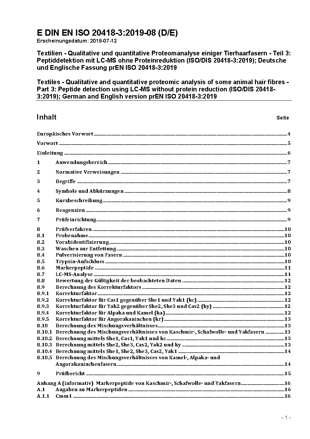 Textilien - Qualitative und quantitative Proteomanalyse einiger Tierhaarfasern - Teil 3: Peptiddetektion mit LC-MS ohne Proteinreduktion (ISO 20418-3:2020); Deutsche Fassung EN ISO 20418-3:2020