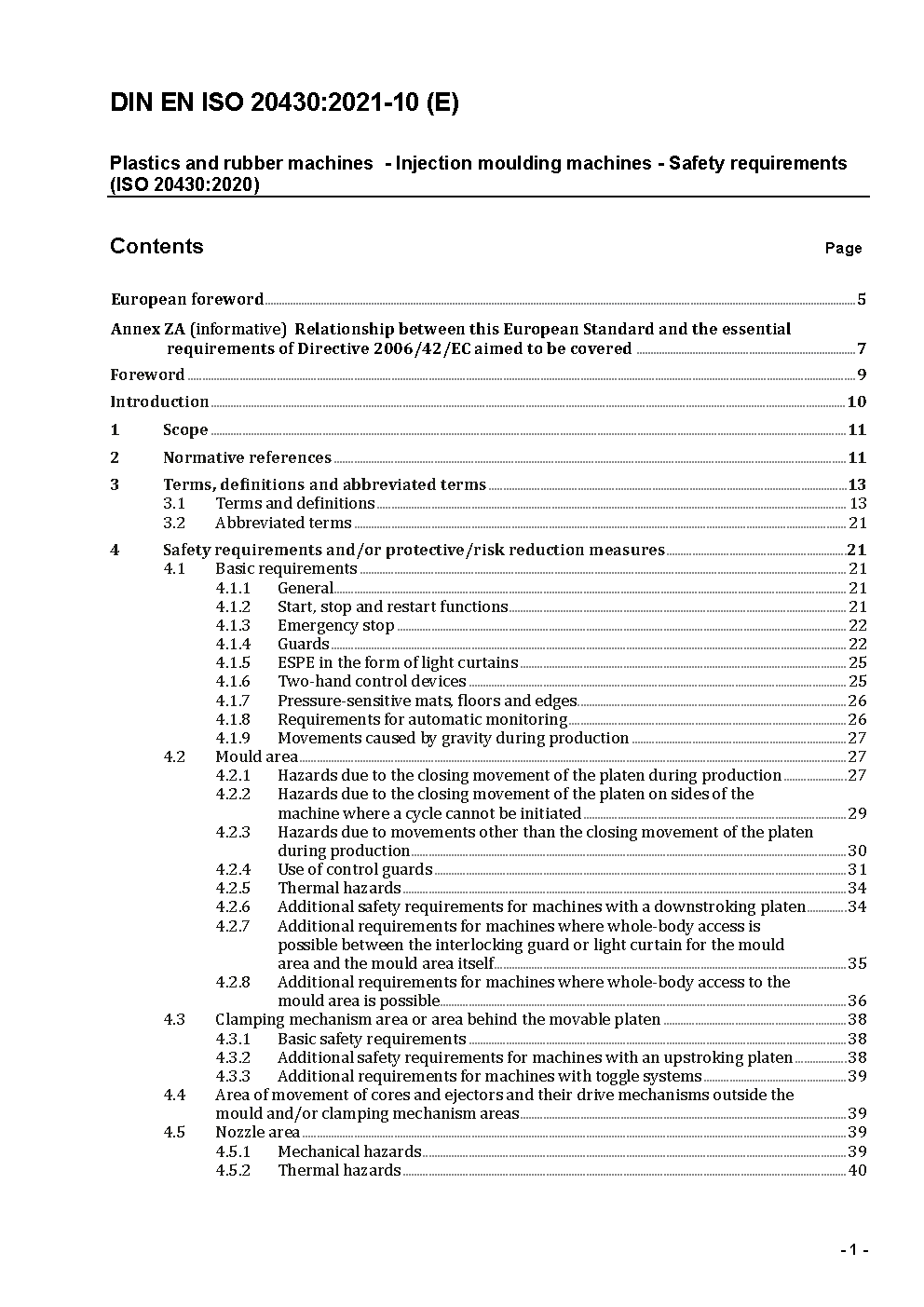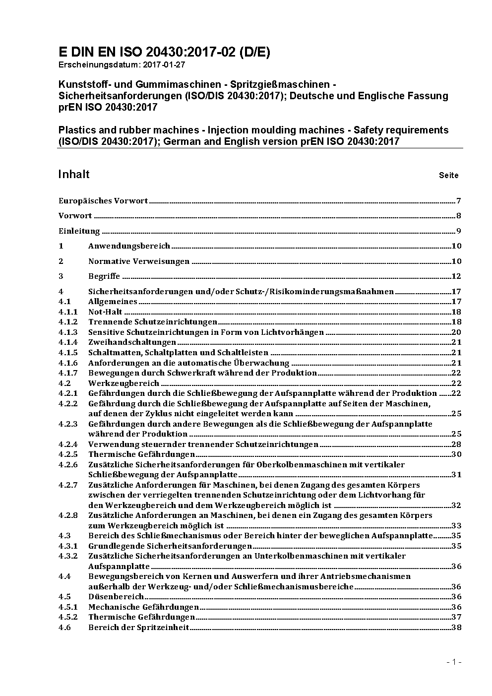 Plastics and rubber machines - Injection moulding machines - Safety requirements (ISO/DIS 20430:2017); German and English version prEN ISO 20430:2017