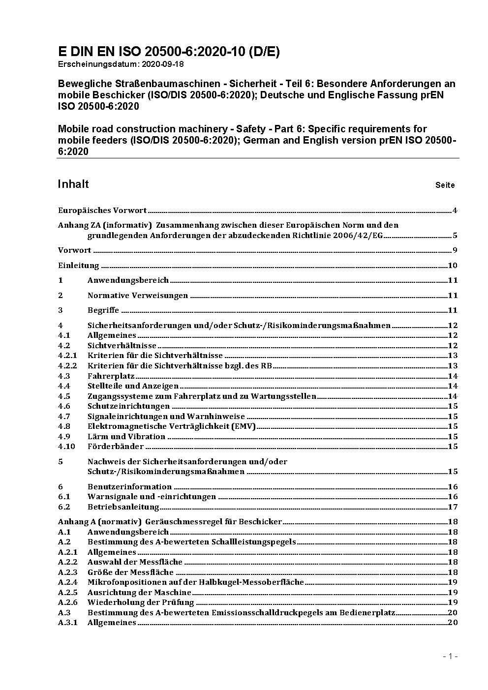Bewegliche Straßenbaumaschinen - Sicherheit - Teil 6: Besondere Anforderungen an mobile Beschicker (ISO/DIS 20500-6:2020); Deutsche und Englische Fassung prEN ISO 20500-6:2020