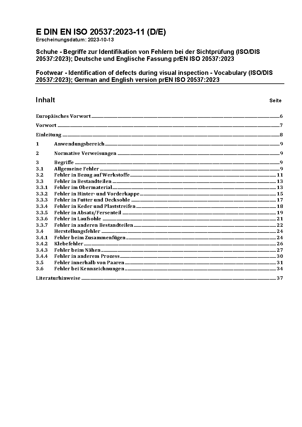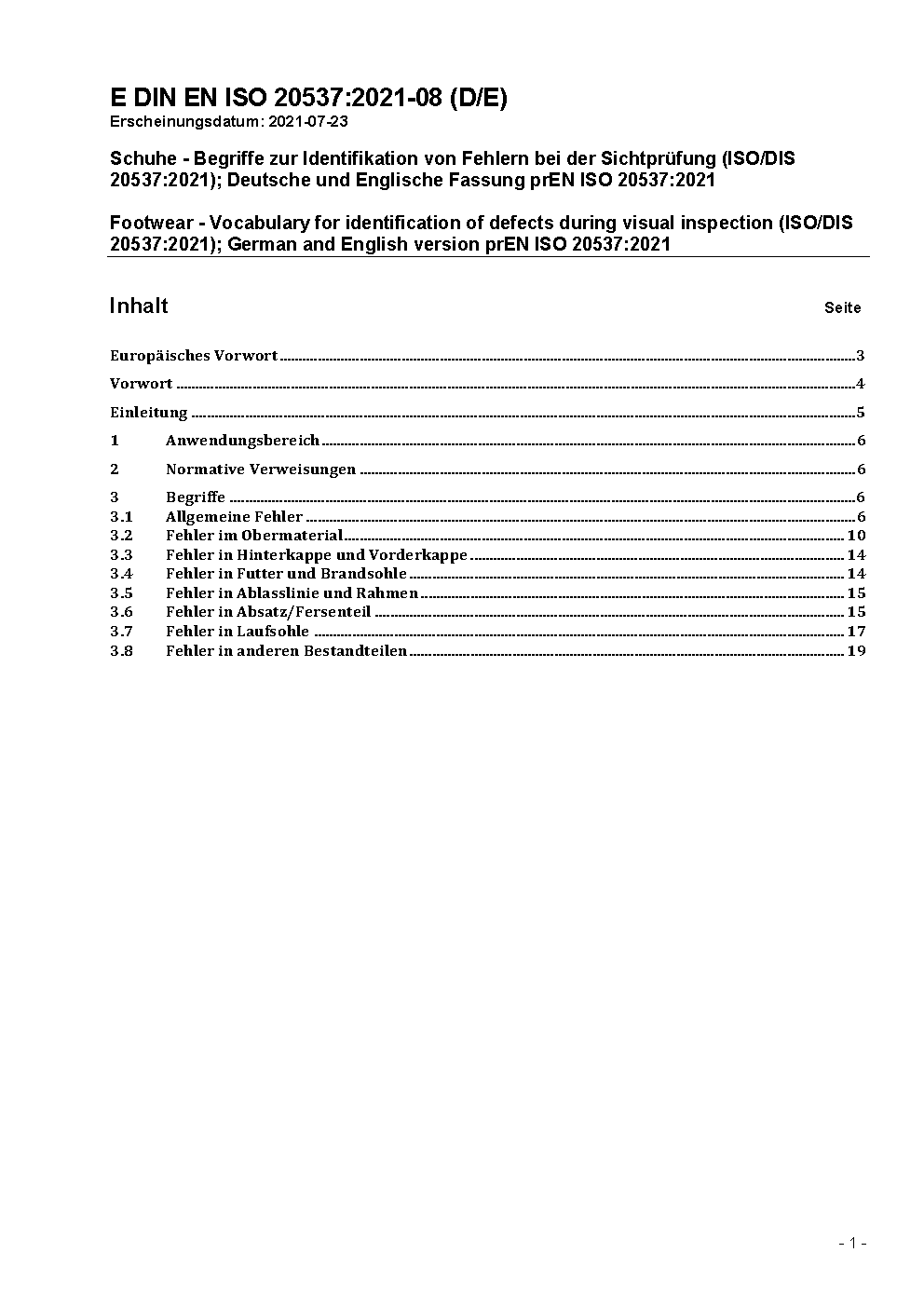 Schuhe - Begriffe zur Identifikation von Fehlern bei der Sichtprüfung (ISO/DIS 20537:2021); Deutsche und Englische Fassung prEN ISO 20537:2021