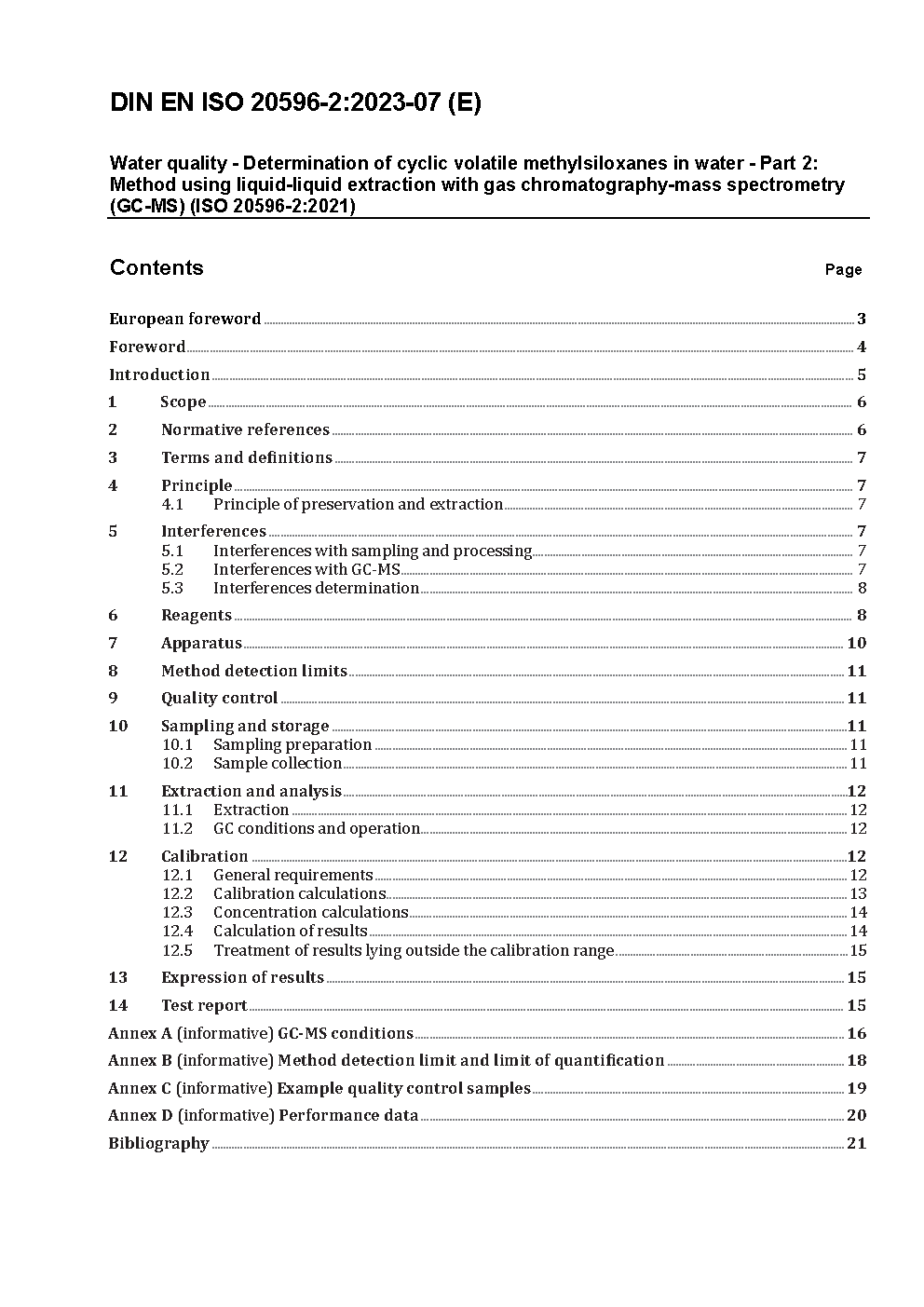 Wasserbeschaffenheit - Bestimmung von cyclischen flüchtigen Methylsiloxanen in Wasser - Teil 2: Verfahren mittels Flüssig-Flüssig-Extraktion und Gaschromatographie-Massenspektrometrie (GC-MS) (ISO 20596-2:2021); Deutsche und Englische Fassung prEN ISO 20596-2:2022