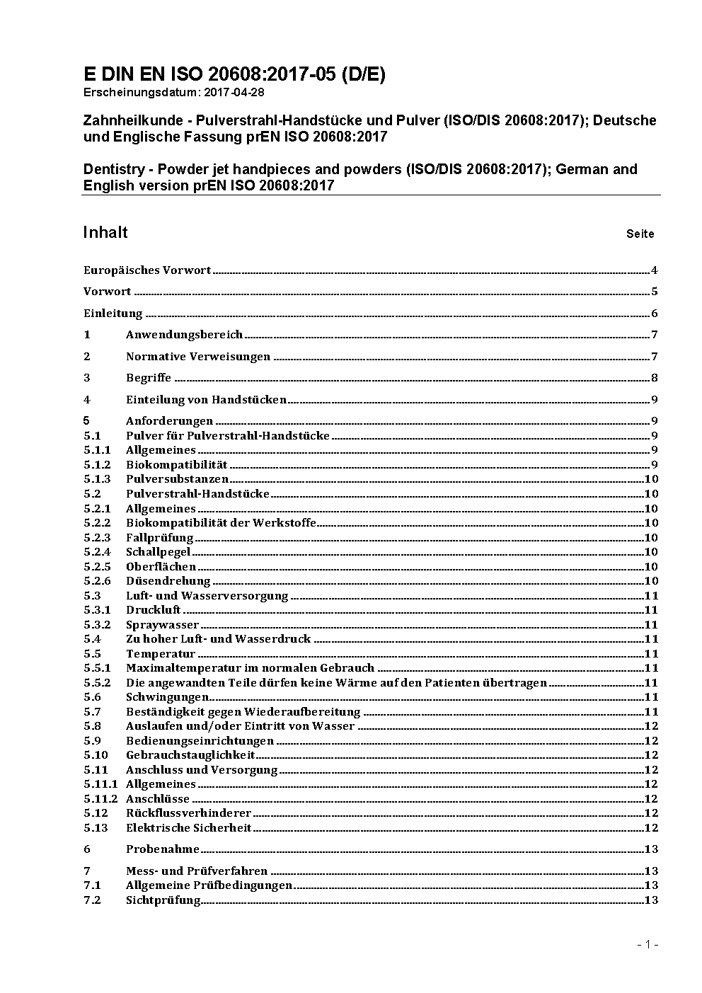 Zahnheilkunde - Pulverstrahl-Handstücke und Pulver (ISO/DIS 20608:2017); Deutsche und Englische Fassung prEN ISO 20608:2017