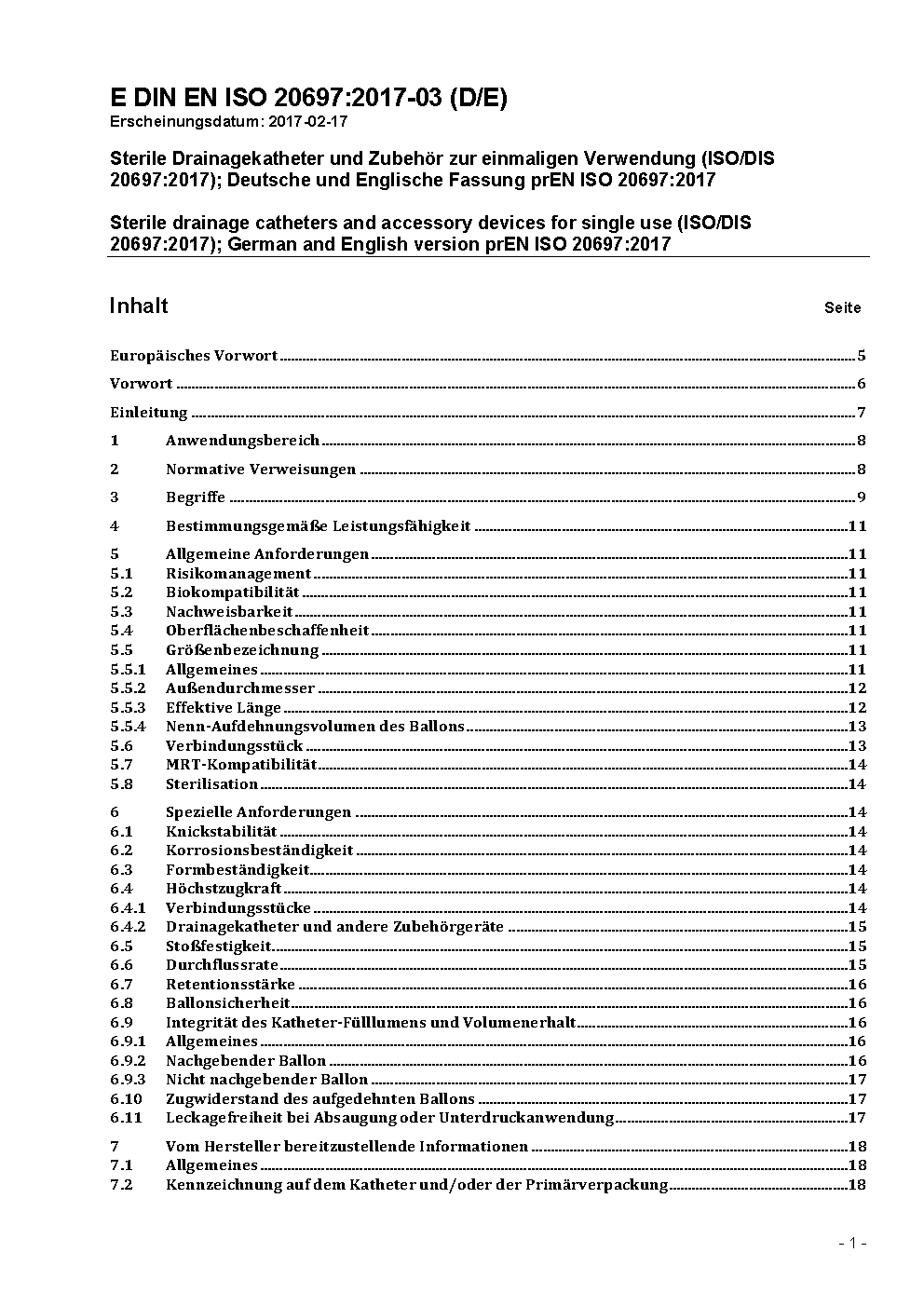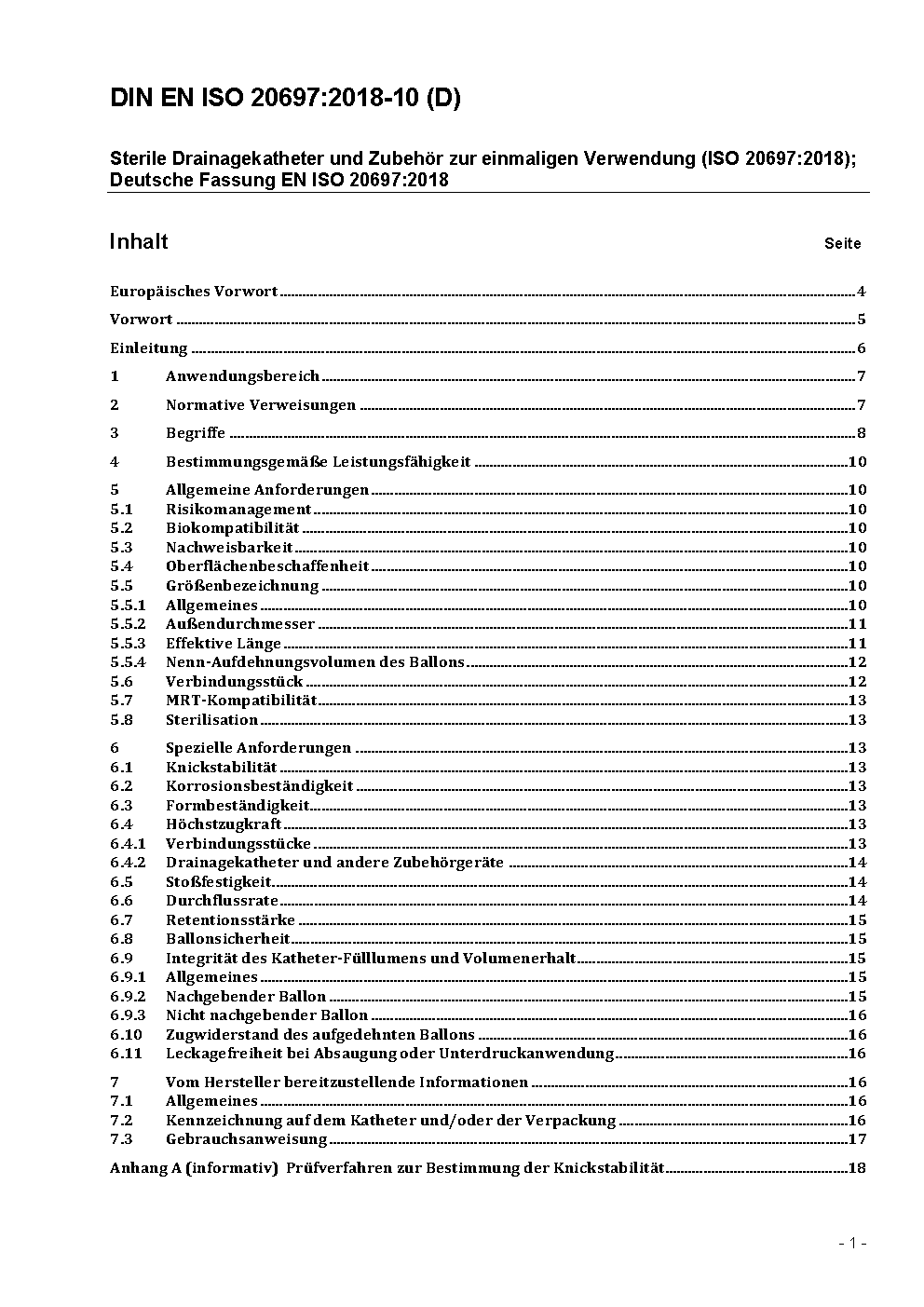Sterile Drainagekatheter und Zubehör zur einmaligen Verwendung (ISO 20697:2018); Deutsche Fassung EN ISO 20697:2018