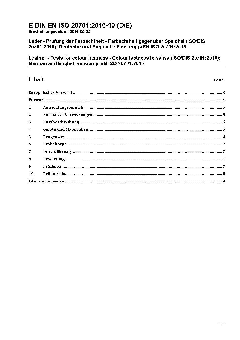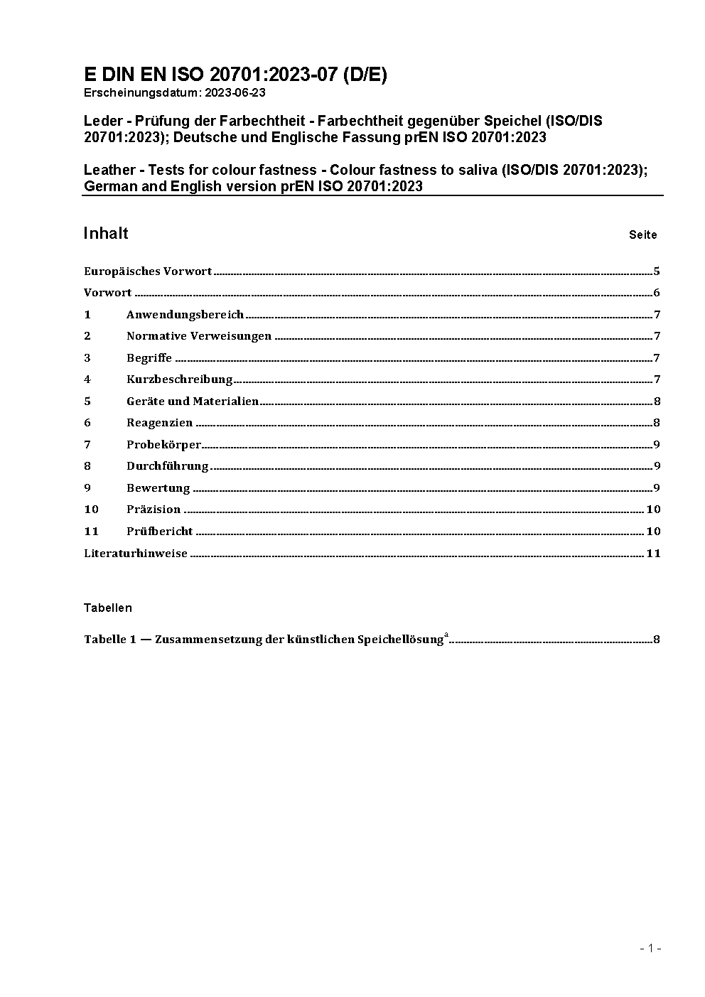 Leder - Prüfung der Farbechtheit - Farbechtheit gegenüber Speichel (ISO/DIS 20701:2023); Deutsche und Englische Fassung prEN ISO 20701:2023