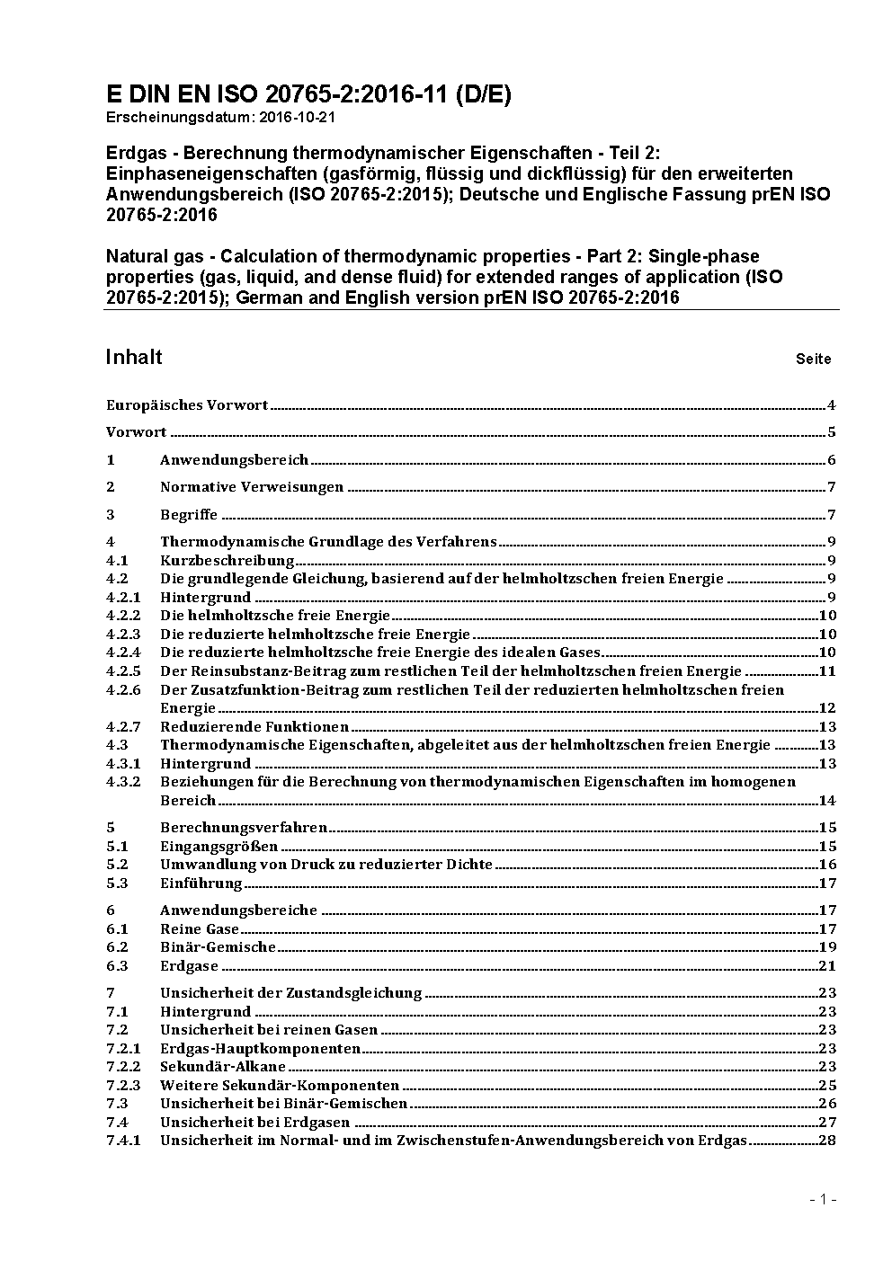 Natural gas - Calculation of thermodynamic properties - Part 2: Single-phase properties (gas, liquid, and dense fluid) for extended ranges of application (ISO 20765-2:2015); German and English version prEN ISO 20765-2:2016