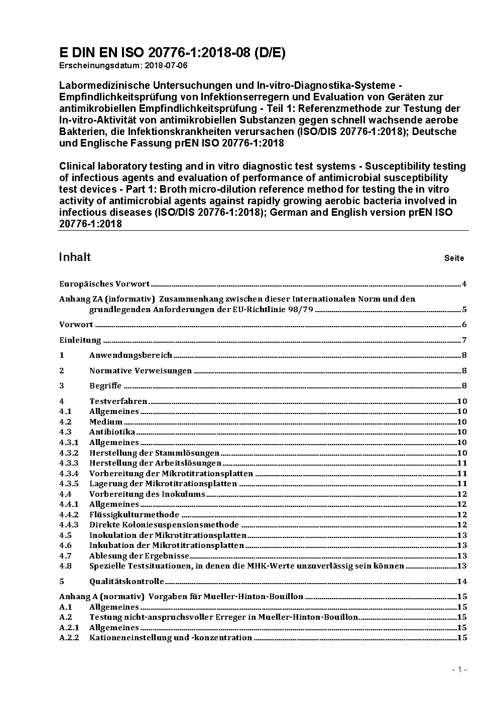 Labormedizinische Untersuchungen und In-vitro-Diagnostika-Systeme - Empfindlichkeitsprüfung von Infektionserregern und Evaluation von Geräten zur antimikrobiellen Empfindlichkeitsprüfung - Teil 1: Referenzmethode zur Testung der In-vitro-Aktivität von antimikrobiellen Substanzen gegen schnell wachsende aerobe Bakterien, die Infektionskrankheiten verursachen (ISO/DIS 20776-1:2018); Deutsche und Englische Fassung prEN ISO 20776-1:2018