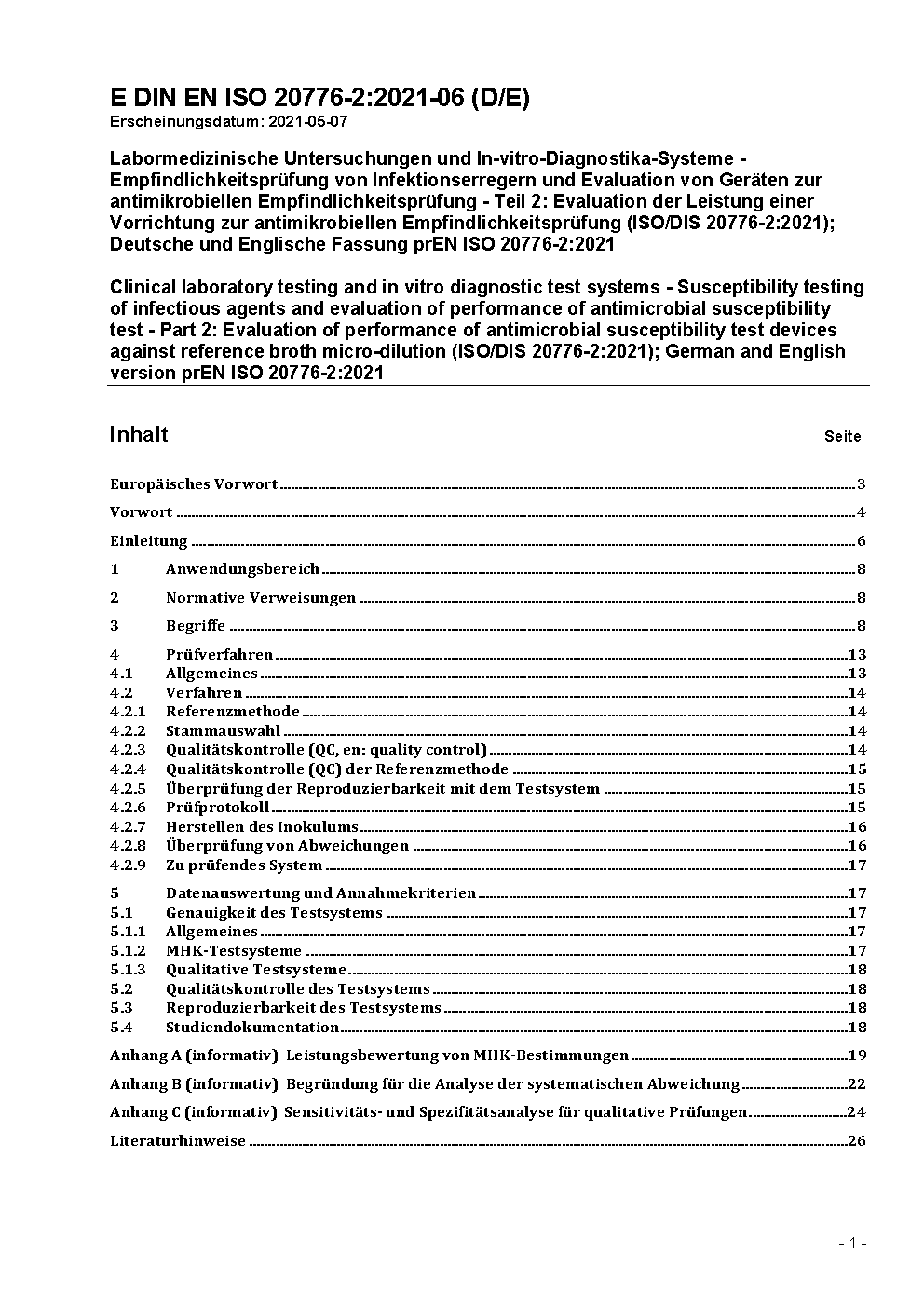 Labormedizinische Untersuchungen und In-vitro-Diagnostika-Systeme - Empfindlichkeitsprüfung von Infektionserregern und Evaluation von Geräten zur antimikrobiellen Empfindlichkeitsprüfung - Teil 2: Evaluation der Leistung von Testsystemen zur antimikrobiellen Empfindlichkeitsprüfung im Vergleich zur Referenzmethode der Bouillon-Mikrodilution (ISO 20776-2:2021); Deutsche Fassung EN ISO 20776-2:2022
