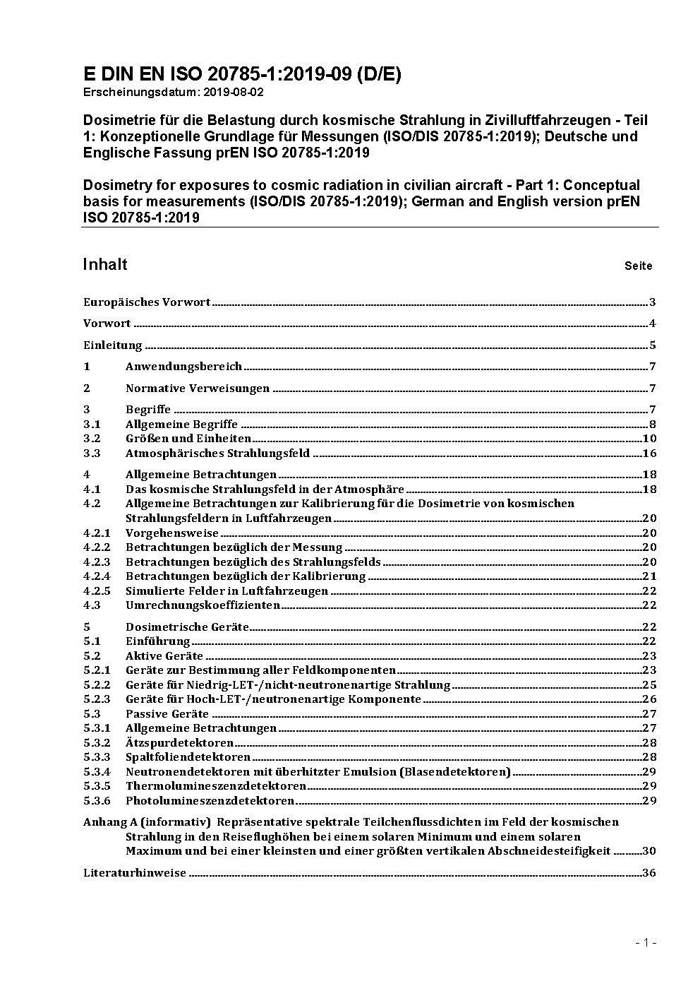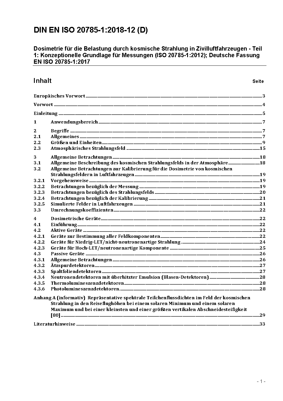 Dosimetrie für die Belastung durch kosmische Strahlung in Zivilluftfahrzeugen - Teil 1: Konzeptionelle Grundlage für Messungen (ISO 20785-1:2012); Deutsche Fassung EN ISO 20785-1:2017 / Achtung: Übergangsfrist, festgelegt durch DIN EN ISO 20785-1 (2021-02), bis 2021-02-28 beachten.
