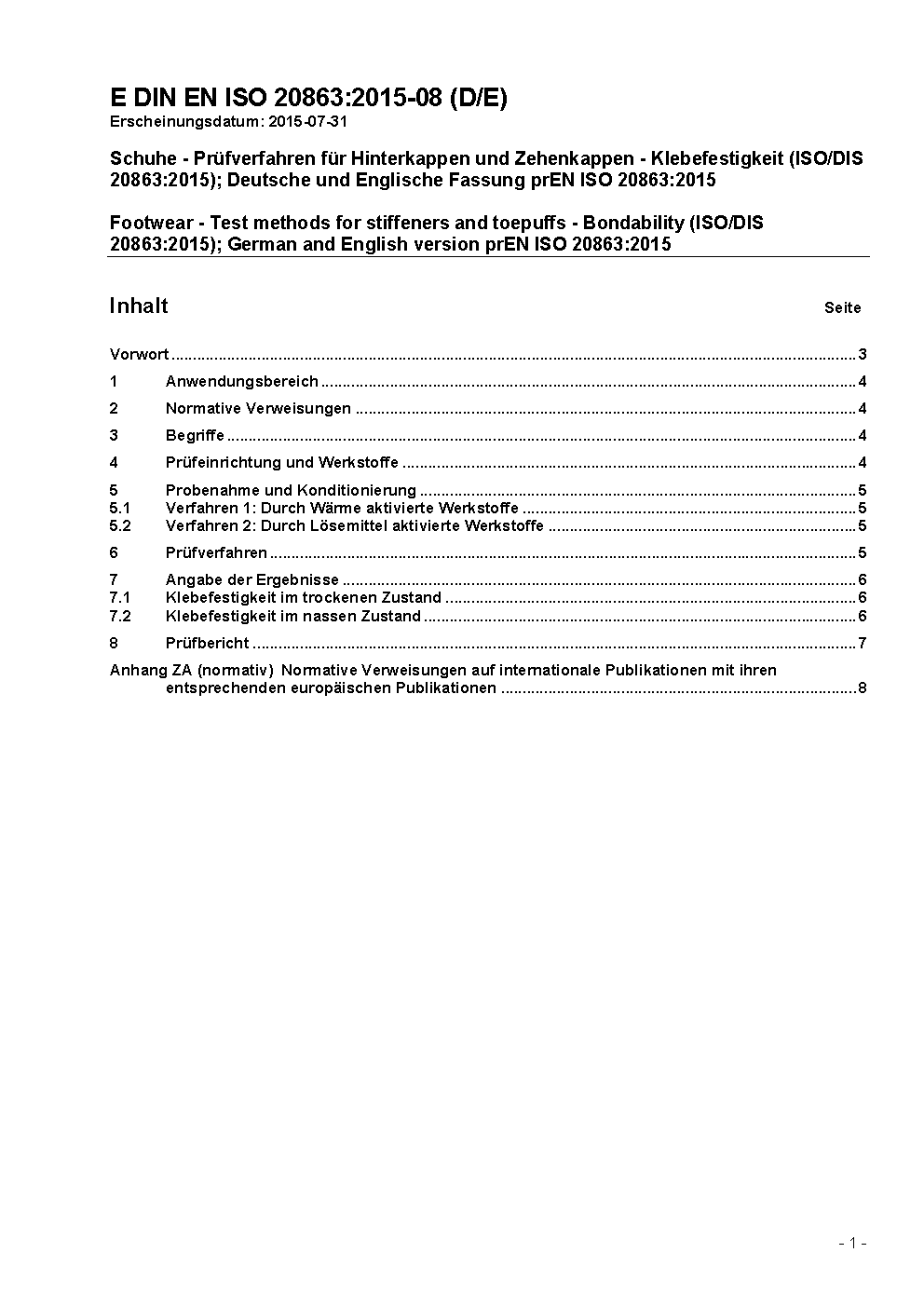 Schuhe - Prüfverfahren für Hinterkappen und Zehenkappen - Klebefestigkeit (ISO/DIS 20863:2015); Deutsche und Englische Fassung prEN ISO 20863:2015