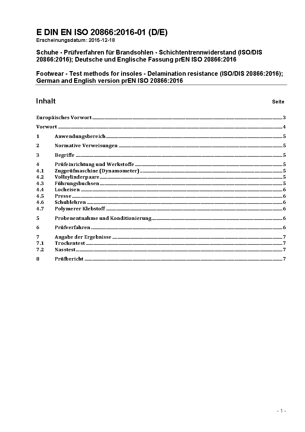 Schuhe - Prüfverfahren für Brandsohlen - Schichtentrennwiderstand (ISO/DIS 20866:2016); Deutsche und Englische Fassung prEN ISO 20866:2016