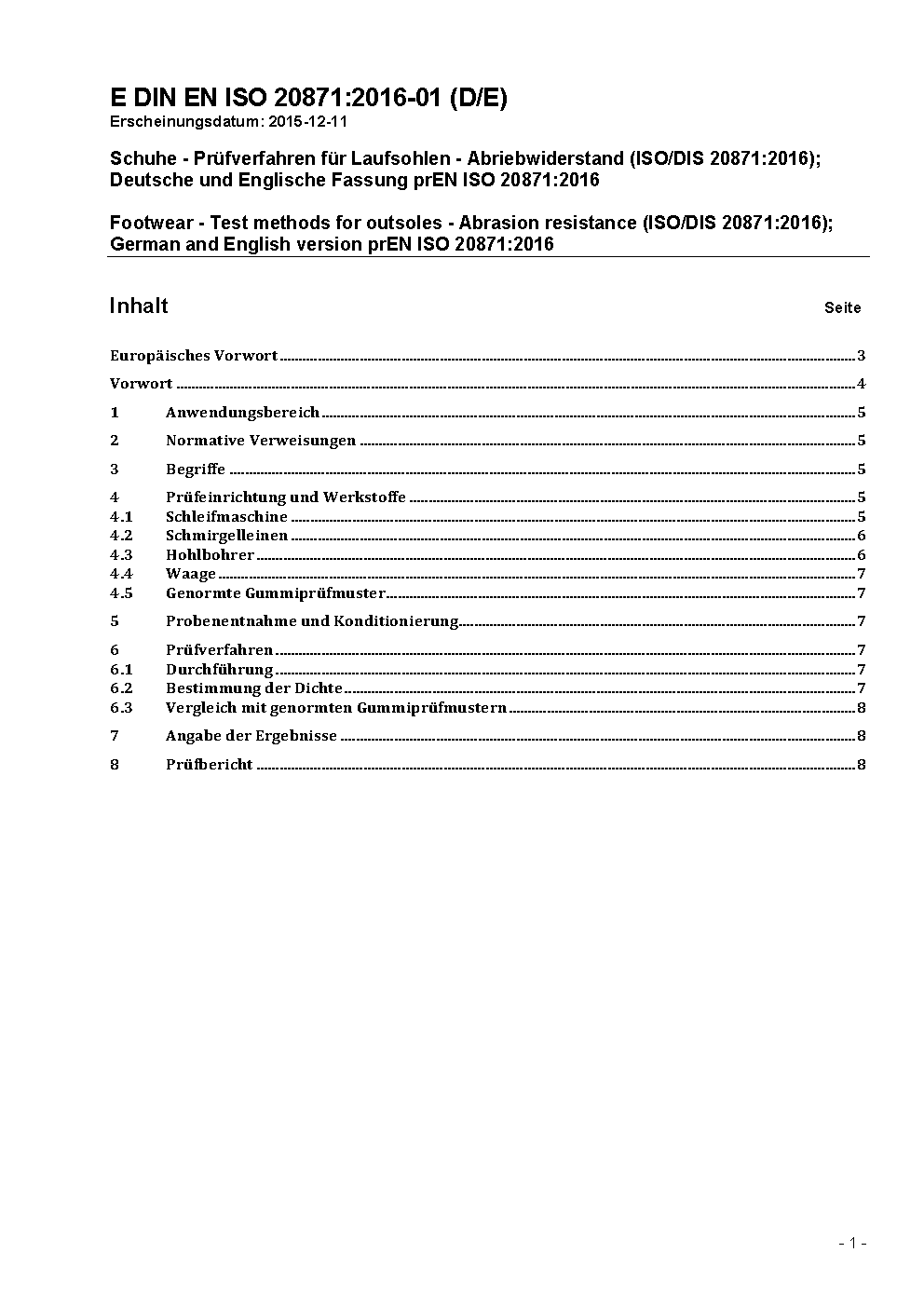 Schuhe - Prüfverfahren für Laufsohlen - Abriebwiderstand (ISO/DIS 20871:2016); Deutsche und Englische Fassung prEN ISO 20871:2016