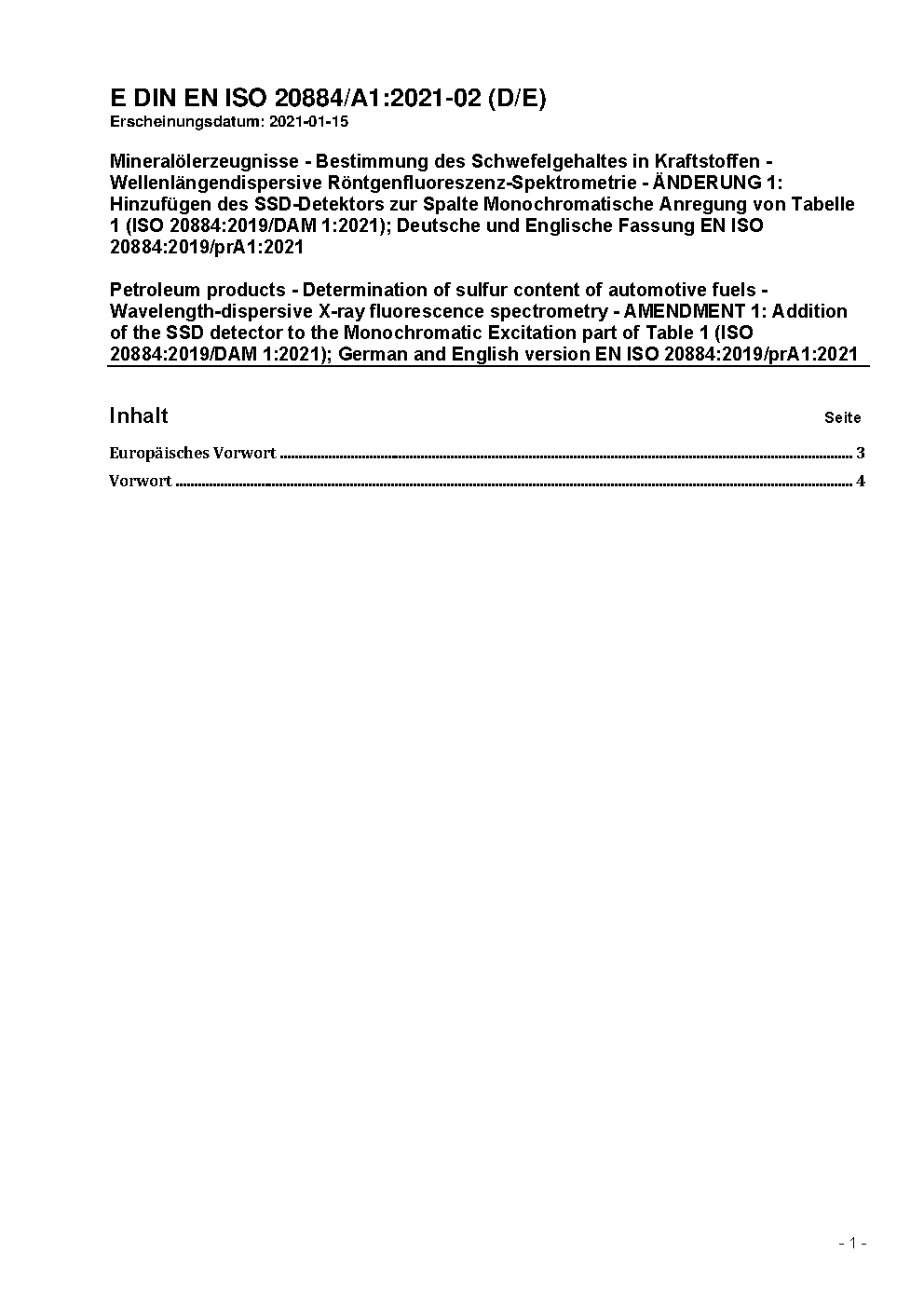 Mineralölerzeugnisse - Bestimmung des Schwefelgehaltes in Kraftstoffen - Wellenlängendispersive Röntgenfluoreszenz-Spektrometrie - ÄNDERUNG 1: Hinzufügen des SSD-Detektors zur Spalte Monochromatische Anregung von Tabelle 1 (ISO 20884:2019/DAM 1:2021); Deutsche und Englische Fassung EN ISO 20884:2019/prA1:2021