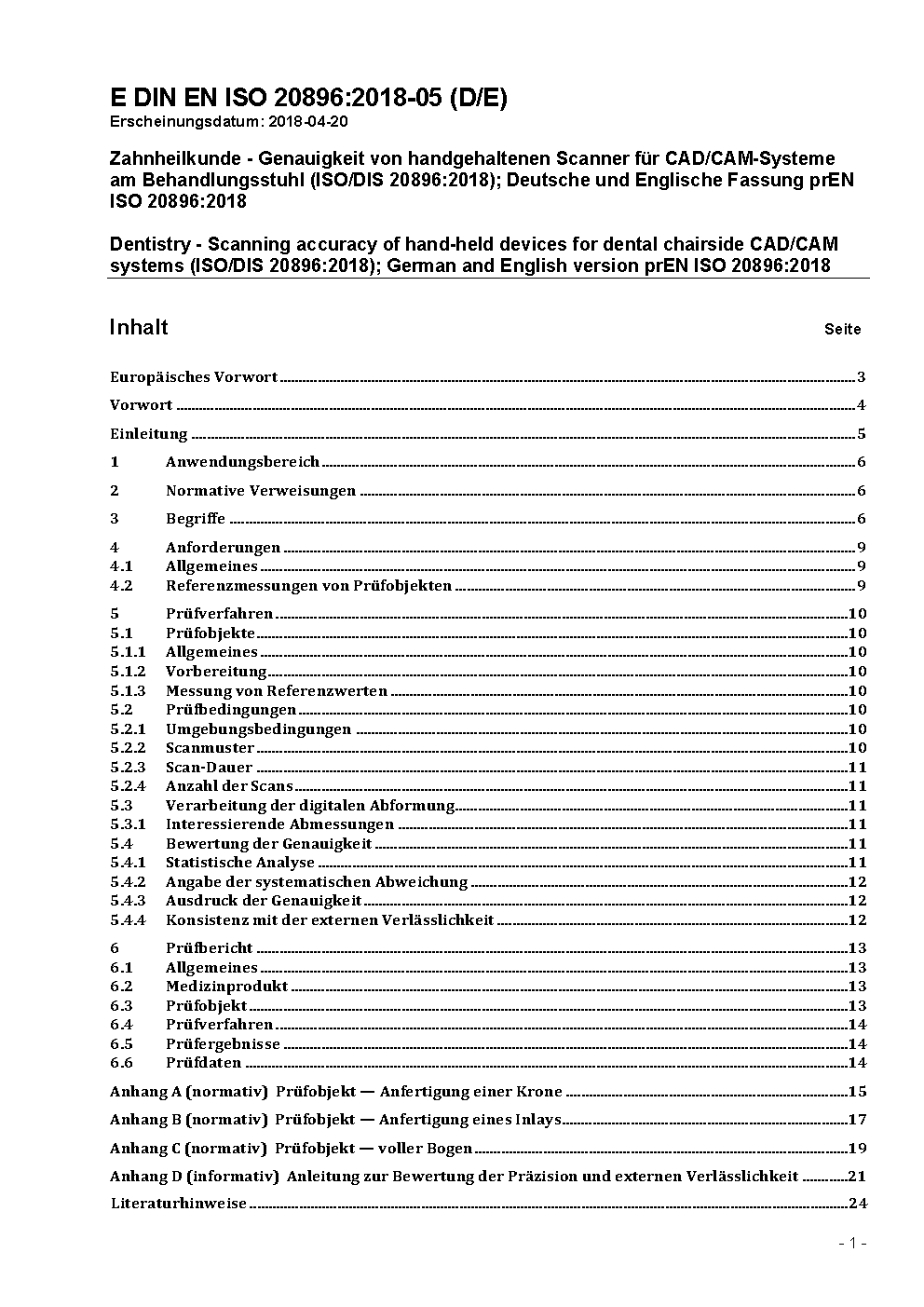 Dentistry - Scanning accuracy of hand-held devices for dental chairside CAD/CAM systems (ISO/DIS 20896:2018); German and English version prEN ISO 20896:2018
