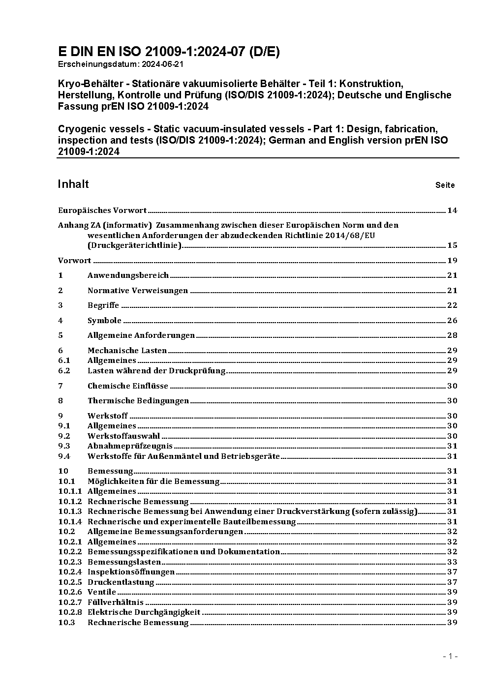 Cryogenic vessels - Static vacuum-insulated vessels - Part 1: Design, fabrication, inspection and tests (ISO/DIS 21009-1:2024); German and English version prEN ISO 21009-1:2024